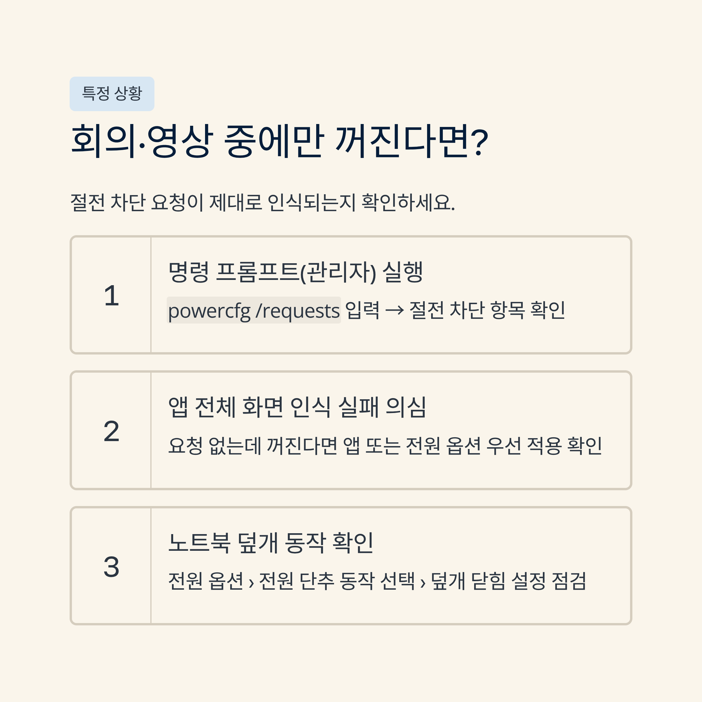 | 특정 작업(회의/영상) 중에만 자주 발생해요. | 요청 상태(powercfg)와 앱의 전체 화면 인식을 점검해요. |