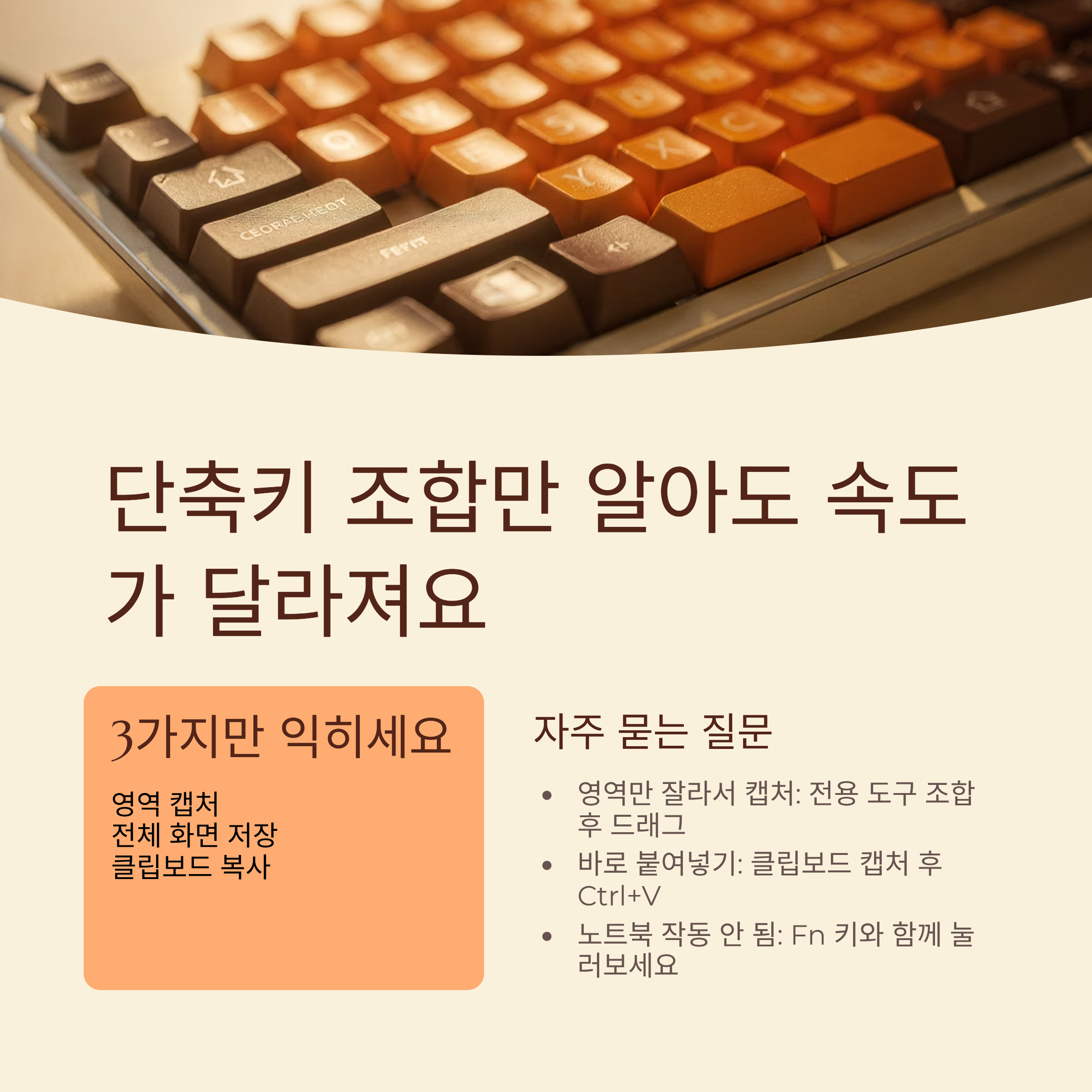 | 노트북에서 단축키가 작동하지 않을 때는 어떻게 할까요? | F키를 기능키로 쓸지 밝기·소리 조절로 쓸지 설정하는 옵션을 확인해 보고, 필요하면 Fn 키와 함께 눌러 보시면 좋아요. |