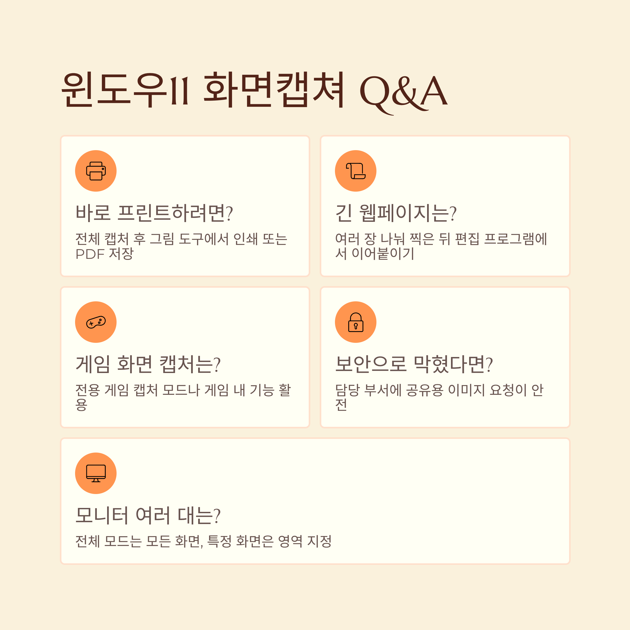 A2. 기본 도구만으로는 한 화면씩 찍는 방식이 많아서, 길게 이어진 페이지는 여러 장으로 나눠 찍은 뒤 편집 프로그램에서 이어 붙이는 편이 현실적이에요.