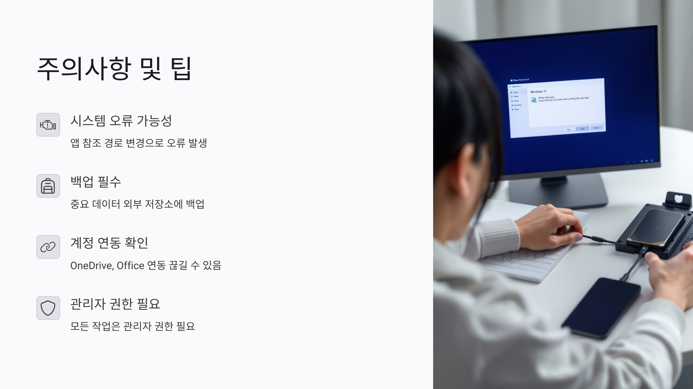 - 백업 필수: 변경 전 중요한 데이터는 반드시 외부 저장소에 백업