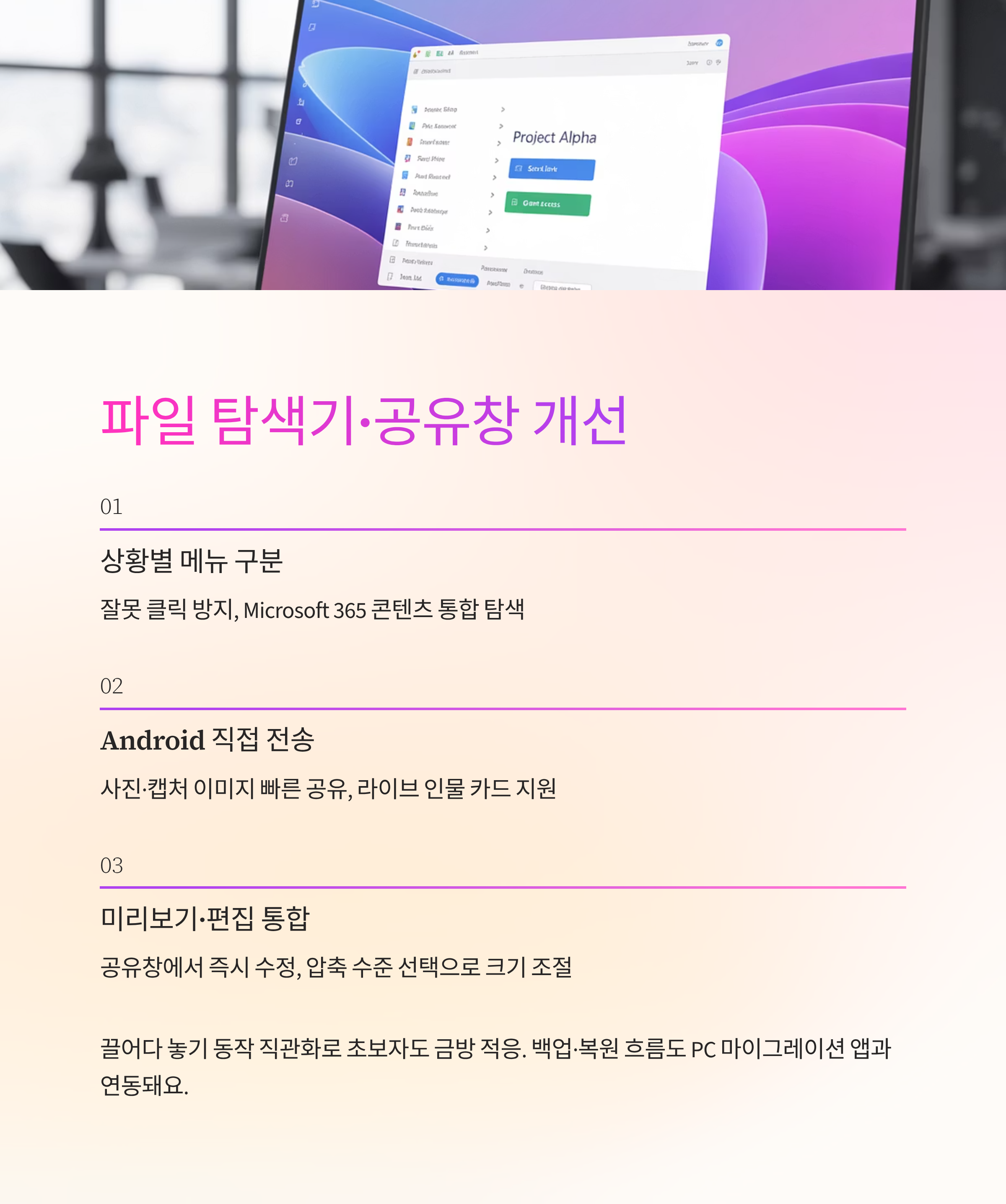 마지막으로, 파일 탐색기와 공유창의 개선은 교육 비용을 낮춰요. 끌어다 놓기, 미리 보기, 권장 앱 같은 패턴은 배우기 쉬워서 매뉴얼을 길게 만들 필요가 없어요. 작은 습관을 바꾸는 데 드는 시간이 줄어드는 만큼, 실제 업무 전환 속도는 생각보다 더 빨라지더라고요.