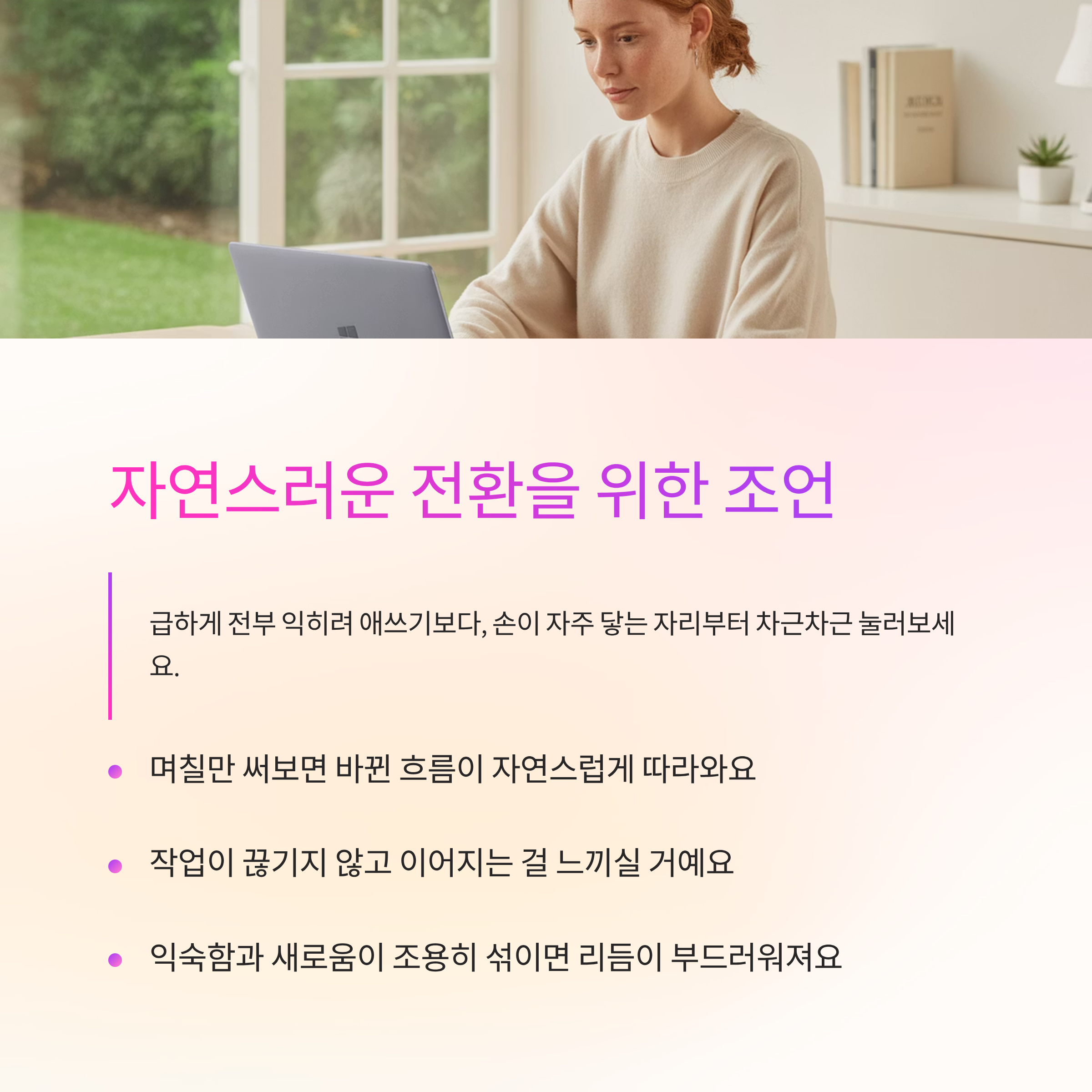 새 버전은 늘 기대와 걱정을 함께 데려오죠. 하지만 이번엔 손이 자주 닿는 자리부터 차근차근 정리되어서, 며칠만 써보면 바뀐 흐름이 자연스럽게 따라와요. 급하게 전부 익히려 애쓰기보다, 오늘 소개한 포인트만 먼저 눌러보세요. 어느 순간부터는 작업이 끊기지 않고 이어지는 걸 느끼실 거예요. 익숙함과 새로움이 조용히 섞이면, 하루의 리듬도 한결 부드러워져요.