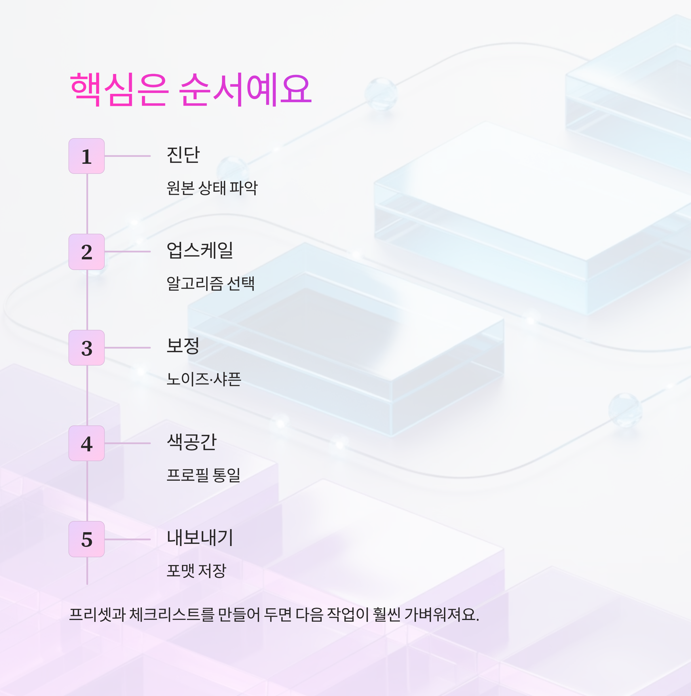 결국 핵심은 순서예요. 진단→업스케일→노이즈·샤픈→색공간→내보내기, 이 흐름만 잡아도 결과가 달라져요. 한 번만 프리셋과 체크리스트를 만들어 두면 다음 작업은 훨씬 가벼워지더라고요. 오늘 만든 기준으로 샘플 세 장부터 돌려 보세요. 금방 손에 감이 잡히고, 품질도 안정적으로 맞춰질 거예요.