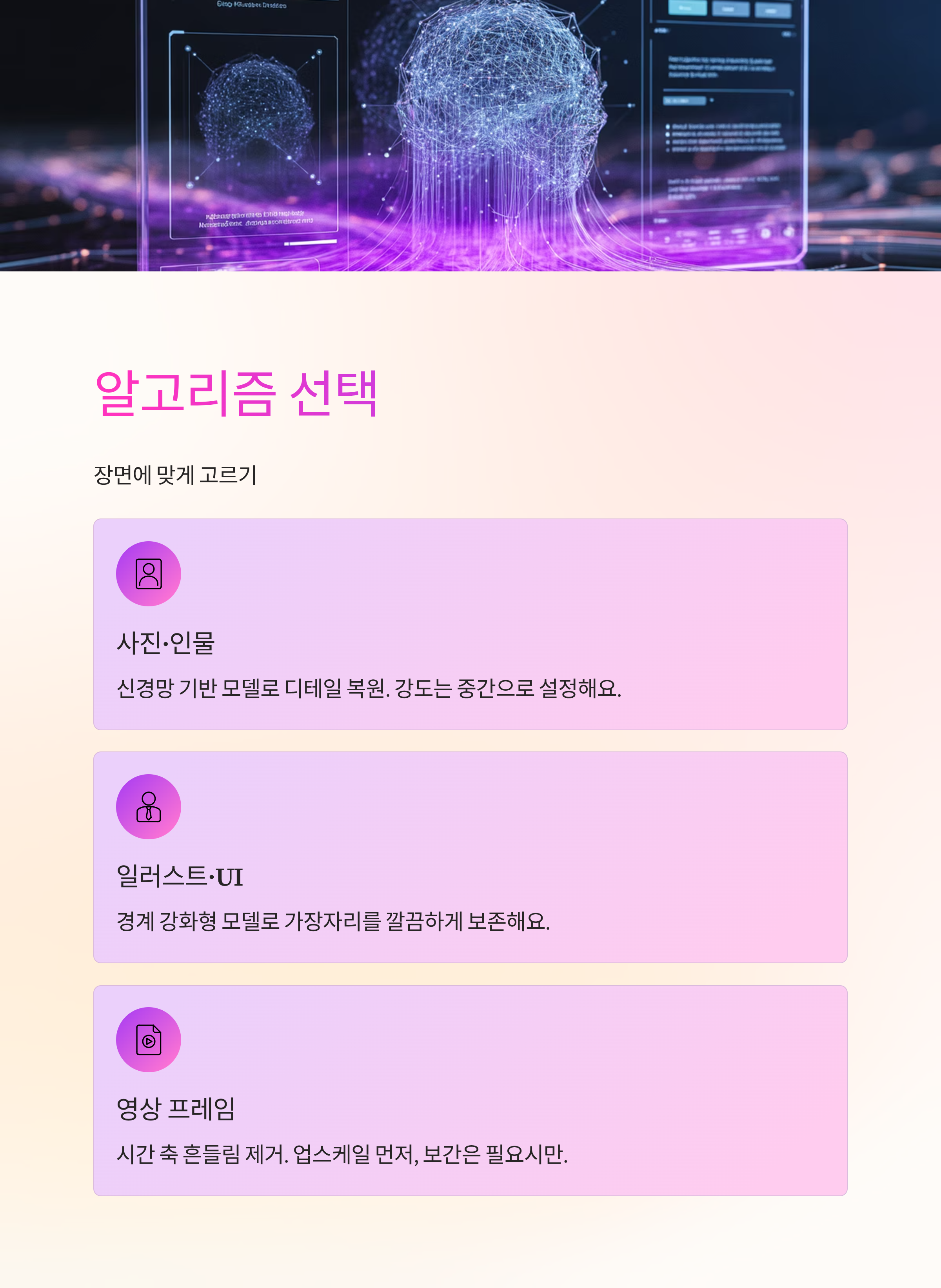 사진·인물엔 디테일 복원을 잘하는 신경망 기반 모델이 유리해요. 대신 과장된 모공이나 가짜 텍스처가 생길 수 있으니 강도를 중간으로 두고 마스크로 얼굴만 조절해요. 일러스트·UI는 가장자리 보존이 핵심이라 경계 강화형 모델이 깔끔해요.