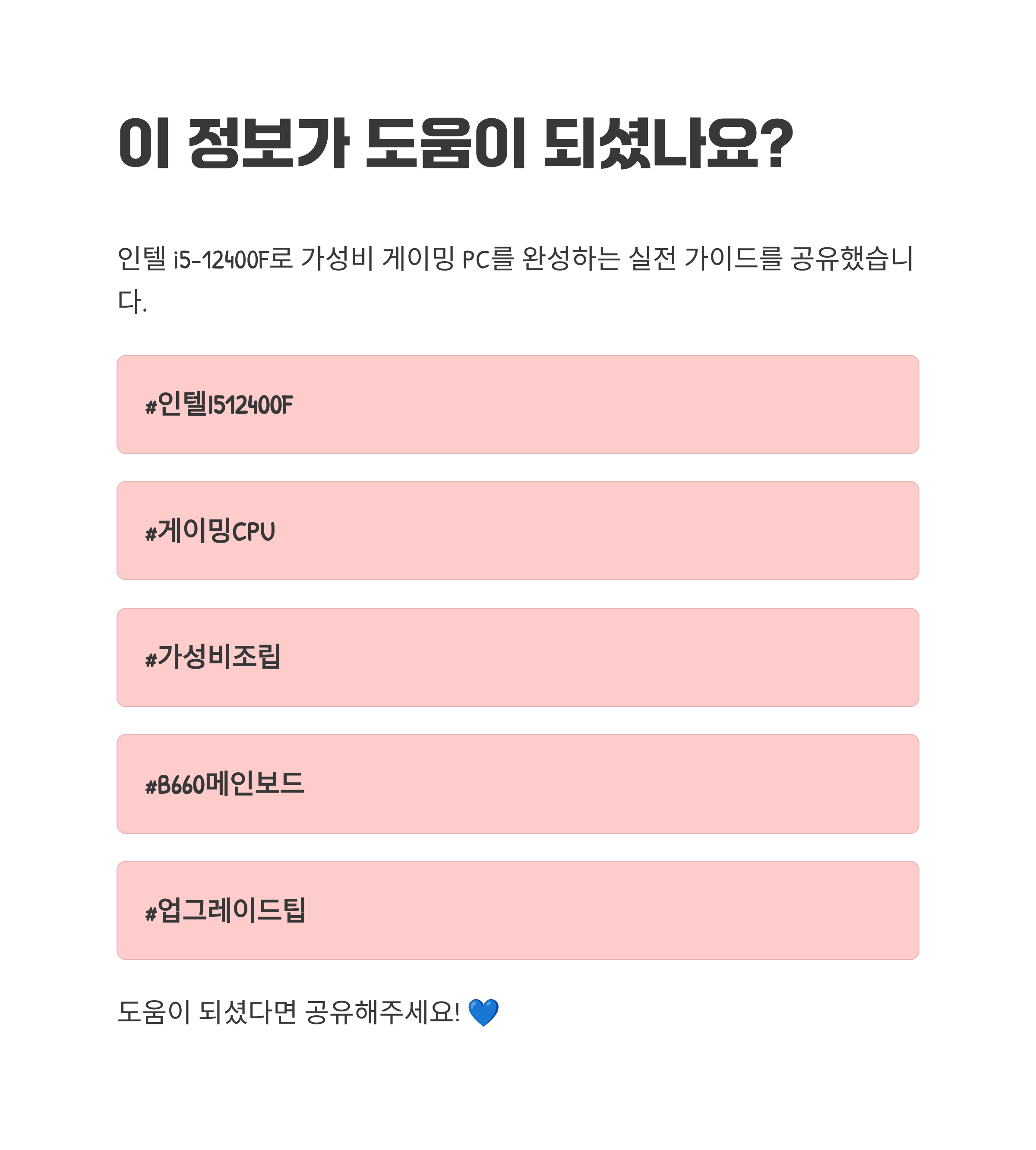 보드 선택 시 와이파이 유무, 후면 USB 개수, 전면 타입 C 지원을 먼저 보세요. 일상에서 체감이 큰 포인트예요. 파워는 정격 550~650W면 대부분 상황을 커버하고, 브론즈 이상이면 안정성이 좋아요. 이 라인업은 내장 그래픽이 없으니, 조립 단계에서 인텔I512400F 사용 시 외장 그래픽카드 장착을 반드시 염두에 두세요. 모르면 헷갈릴 수밖에 없어요.