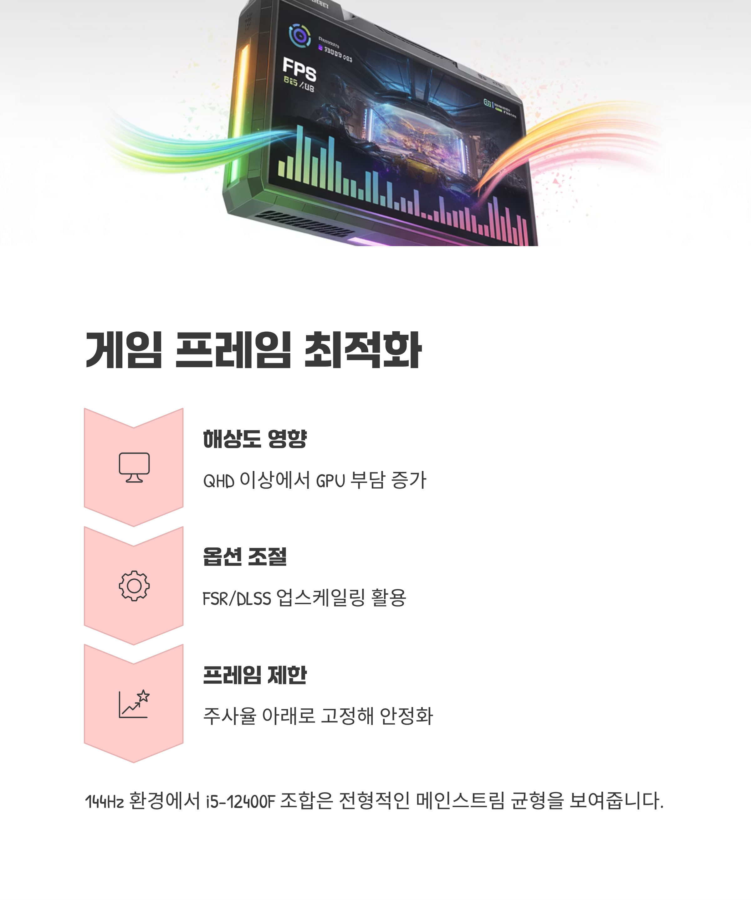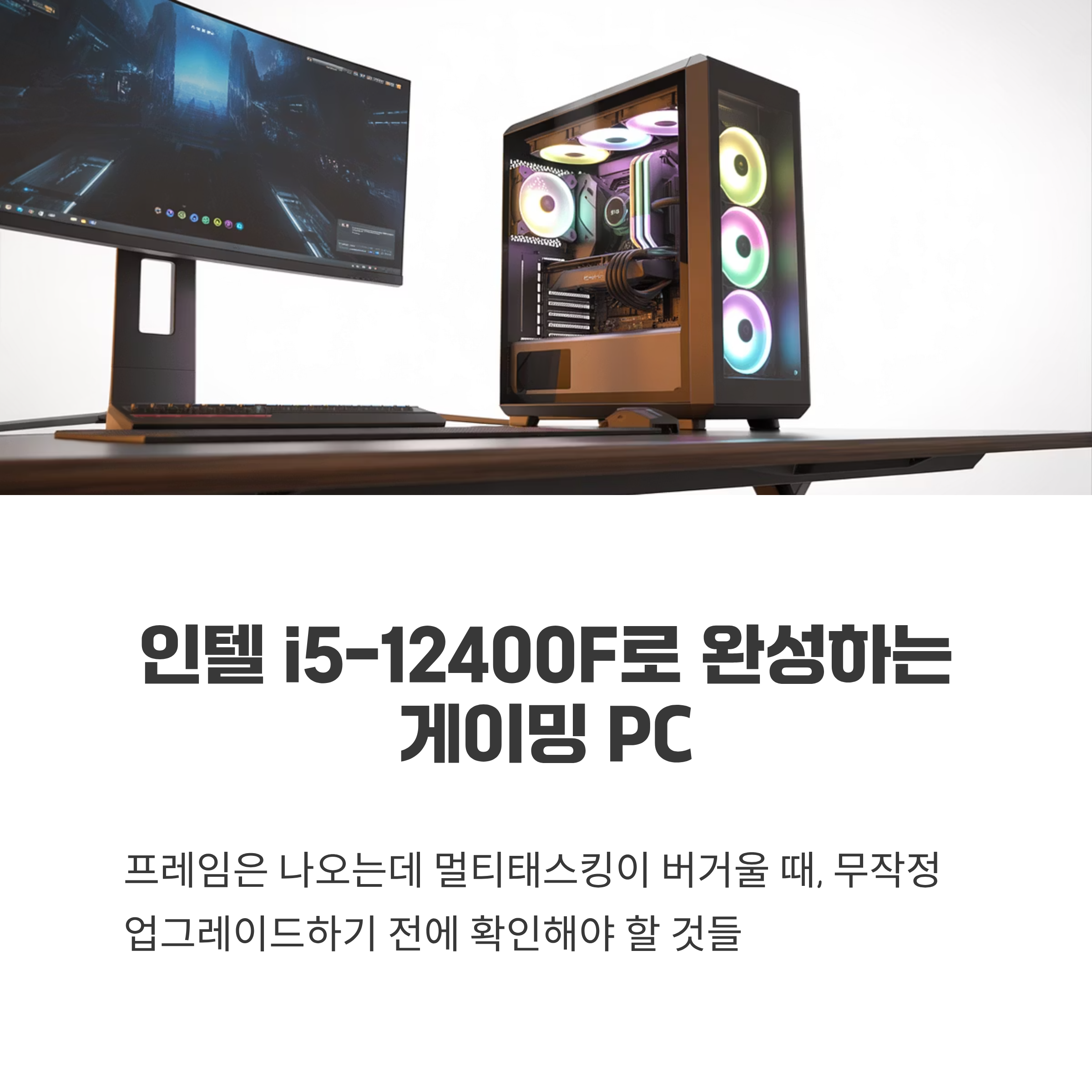 동급 그래픽카드와 조합했을 때 중저해상도에서는 CPU 차이가 프레임에 꽤 민감하게 반영돼요. 하지만 QHD 이상으로 올라가면 GPU 부담이 커져 CPU 간 격차가 줄어들어요. 그래서 업그레이드 우선순위는 상황에 따라 달라지고, 144Hz 환경에서 인텔I512400F 조합은 전형적인 메인스트림 균형을 보여줘요. 옵션을 잘 조절하면 체감은 생각보다 상위 라인과 가깝게 나와요.