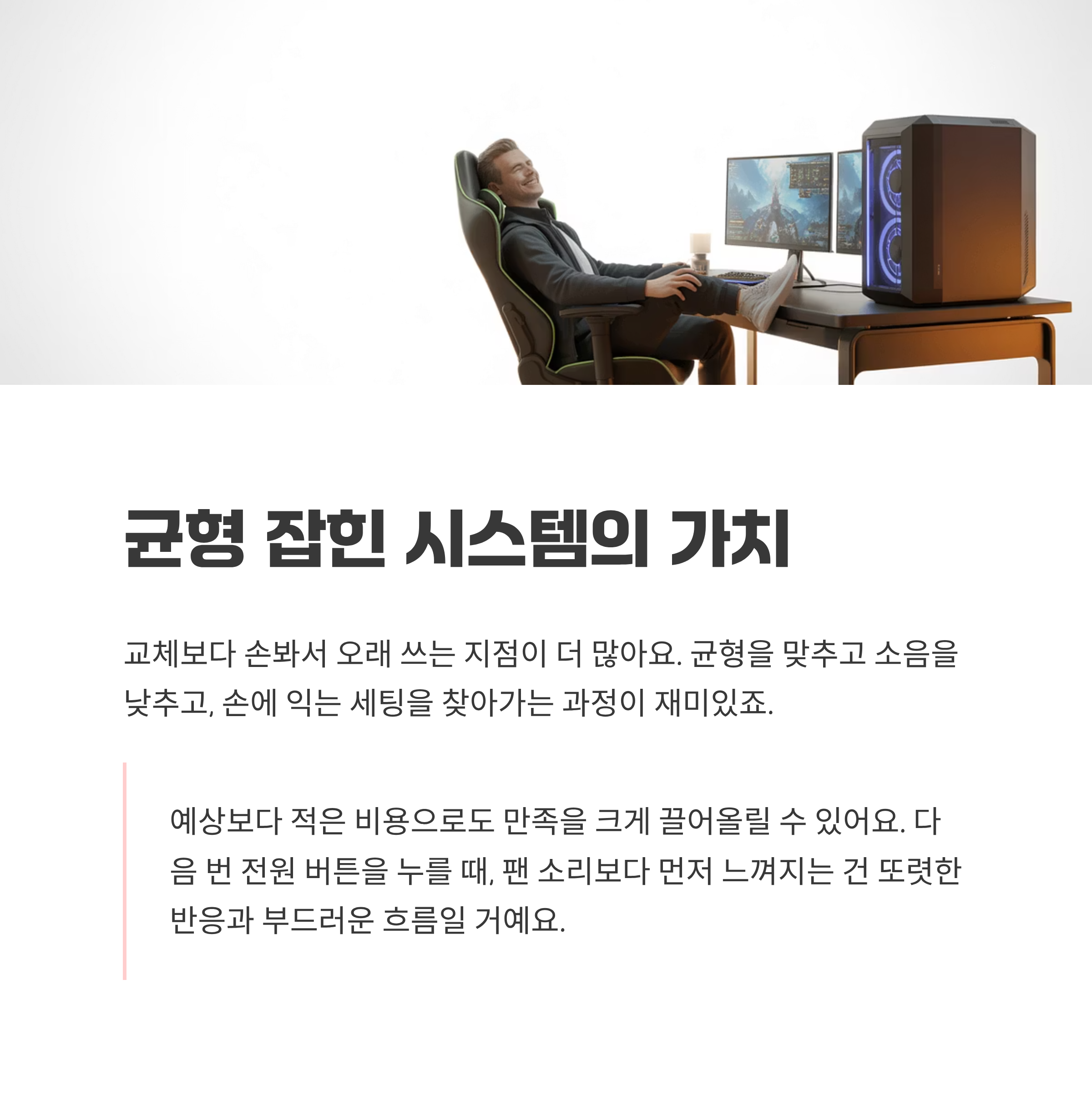 컴퓨터를 오래 쓰다 보면 교체보다 손봐서 오래 쓰는 지점이 더 많아요. 균형을 맞추고 소음을 낮추고, 손에 익는 세팅을 찾아가는 과정이 은근히 재미있죠. 오늘 정리한 기준들을 하나씩 체크해보면, 예상보다 적은 비용으로도 만족을 크게 끌어올릴 수 있어요. 다음 번 전원 버튼을 누를 때, 팬 소리보다 먼저 느껴지는 건 또렷한 반응과 부드러운 흐름일 거예요. 그 순간이면, 업그레이드의 방향이 더 선명해질 거예요.