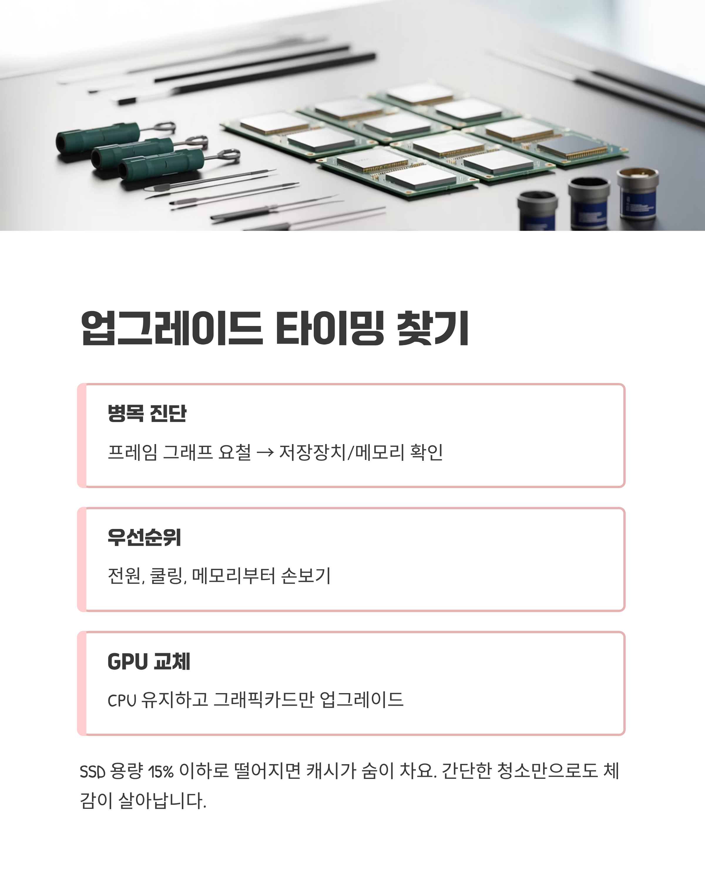 그래픽카드를 바꿀 계획이 없다면, 전원과 쿨링, 메모리부터 손보는 게 투자 대비 효과가 커요. 파워가 오래됐다면 교체만으로도 시스템 안정성이 확 올라가요. 팬 교체와 먼지 정리도 소음을 크게 줄여요. 생각보다 간단하게 해결되더라고요.