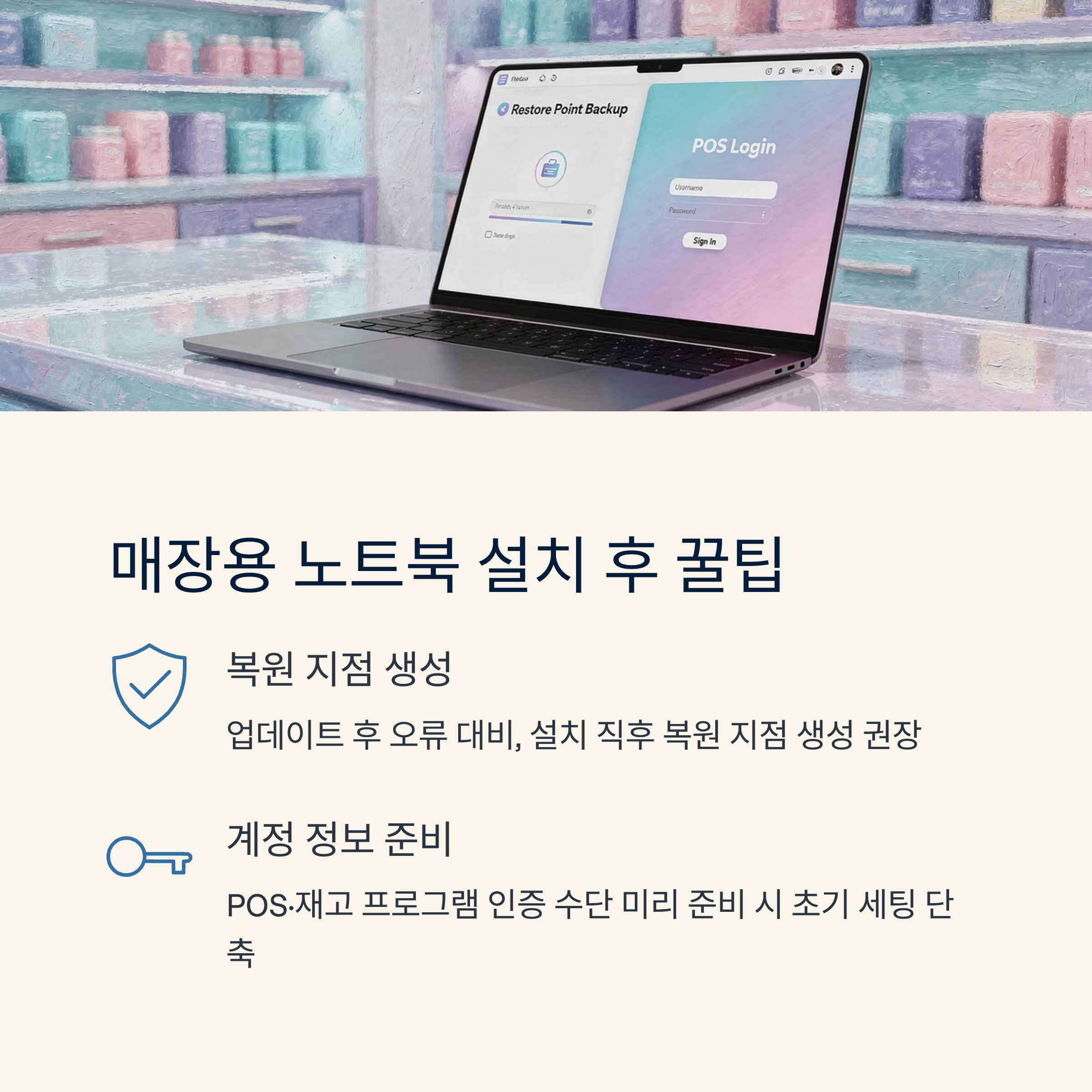 그리고 POS/재고 프로그램은 설치 전에 계정 정보나 인증 수단을 미리 준비해 두면 초기 세팅 시간이 줄어들어요.