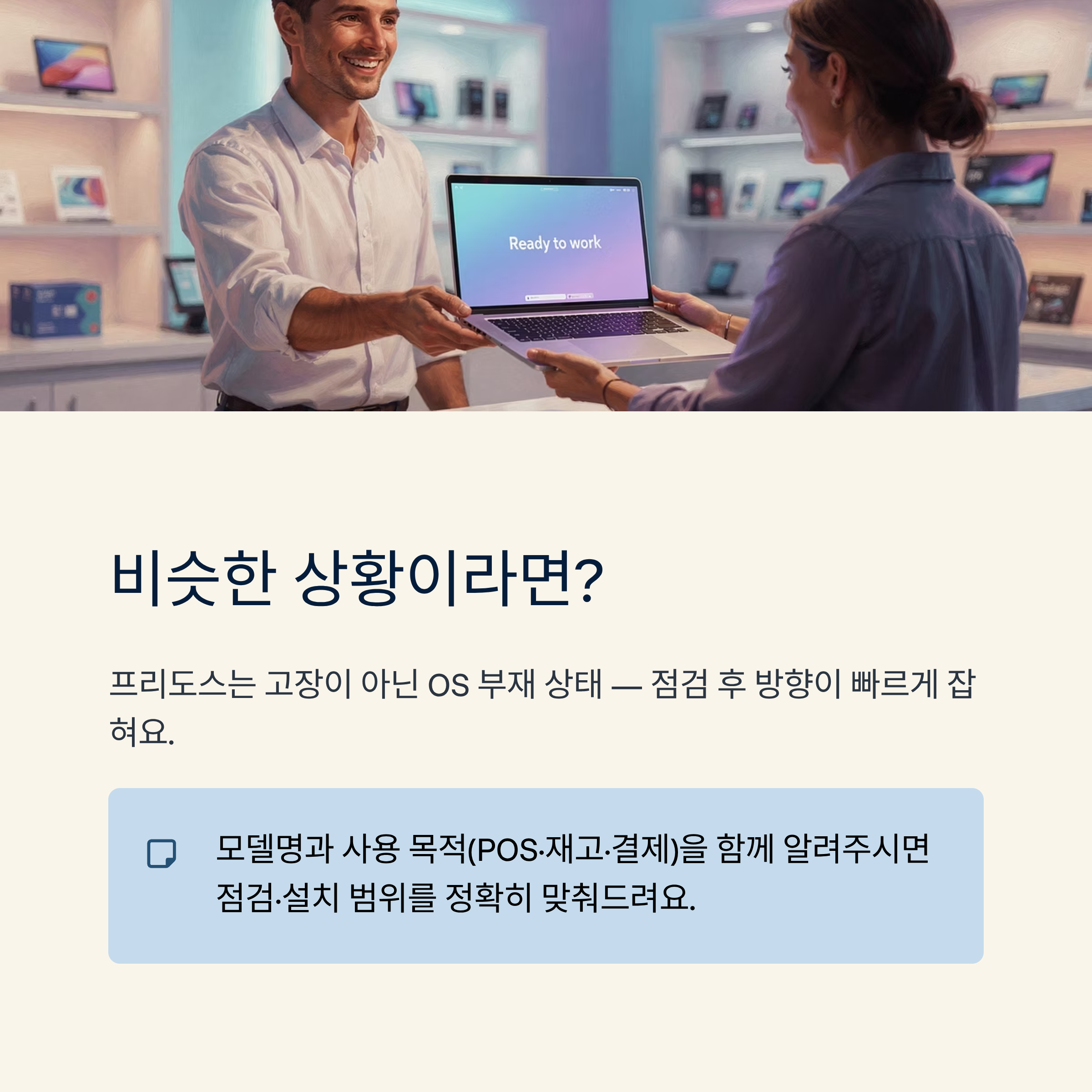 비슷한 상황이라면 모델명과 사용 목적(POS/재고/결재)을 함께 알려주시면 필요한 점검과 설치 범위를 더 정확히 맞출 수 있어요.