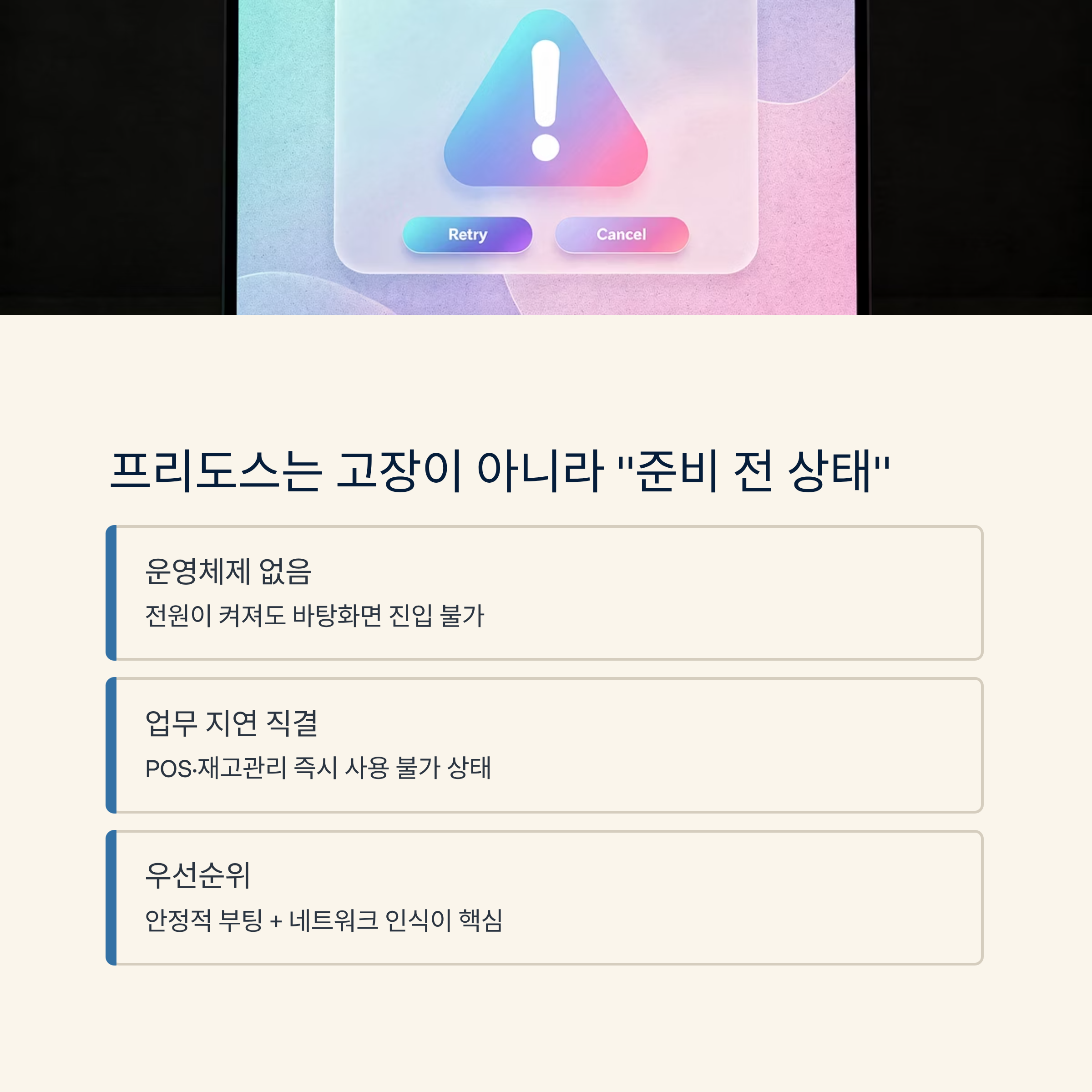 활용 상황 매장용 POS/재고 관리 PC가 당장 필요할 때, OS 부재로 업무 시작이 막힐 때