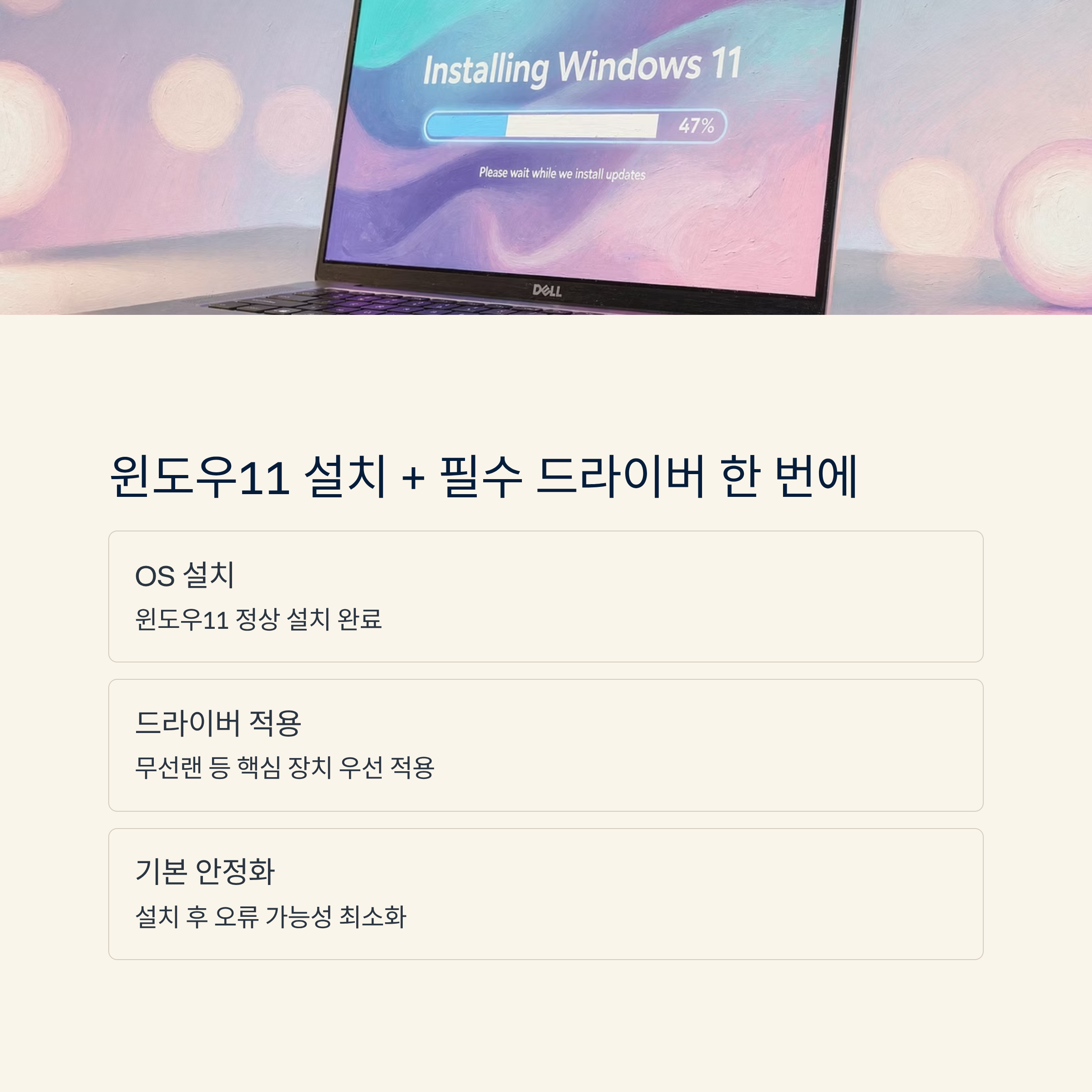 하드웨어 이상은 없고 윈도우11만 설치하면 되는 상태라, 설치와 필수 드라이버 적용까지 이어서 바로 업무 투입이 가능하게 맞춰드렸어요.