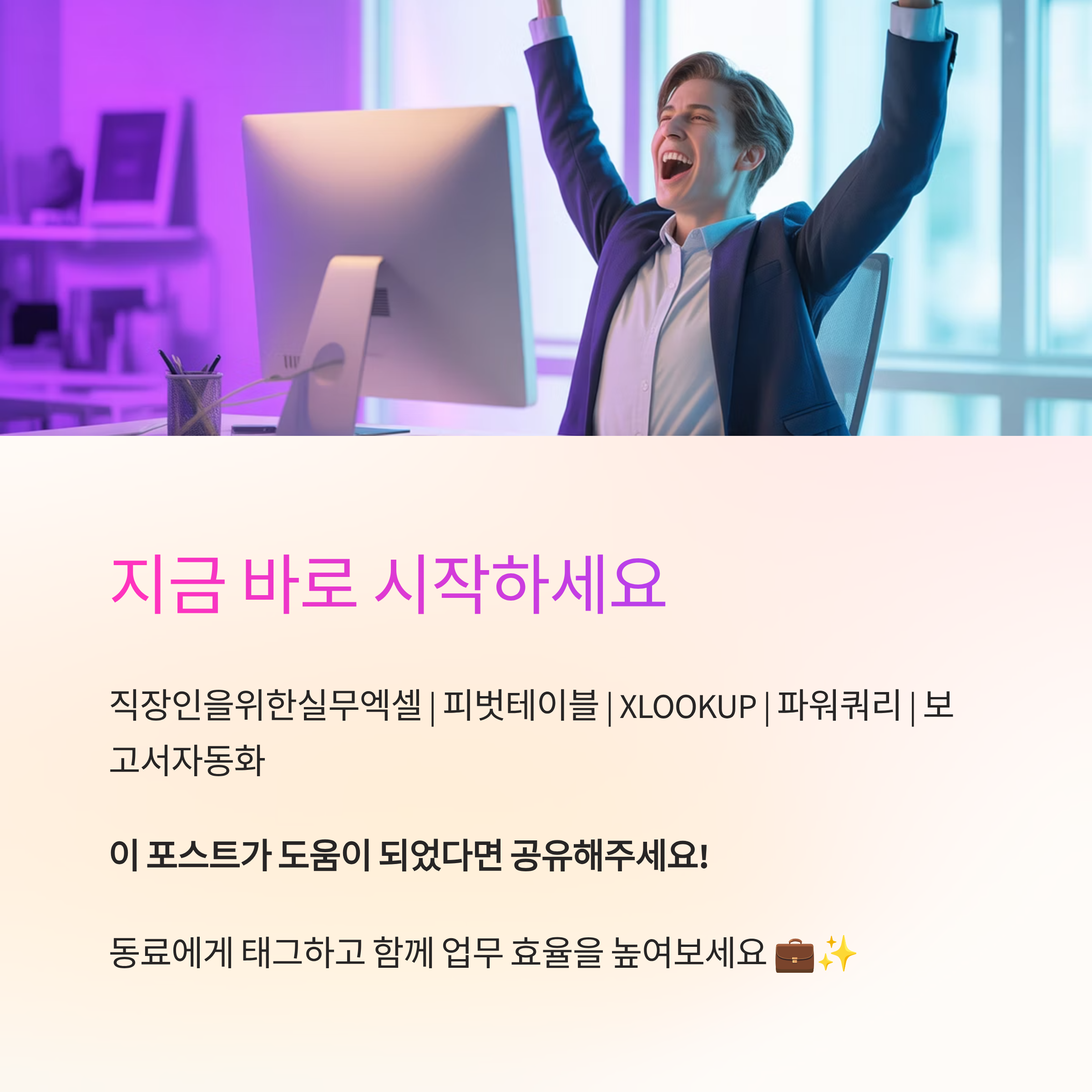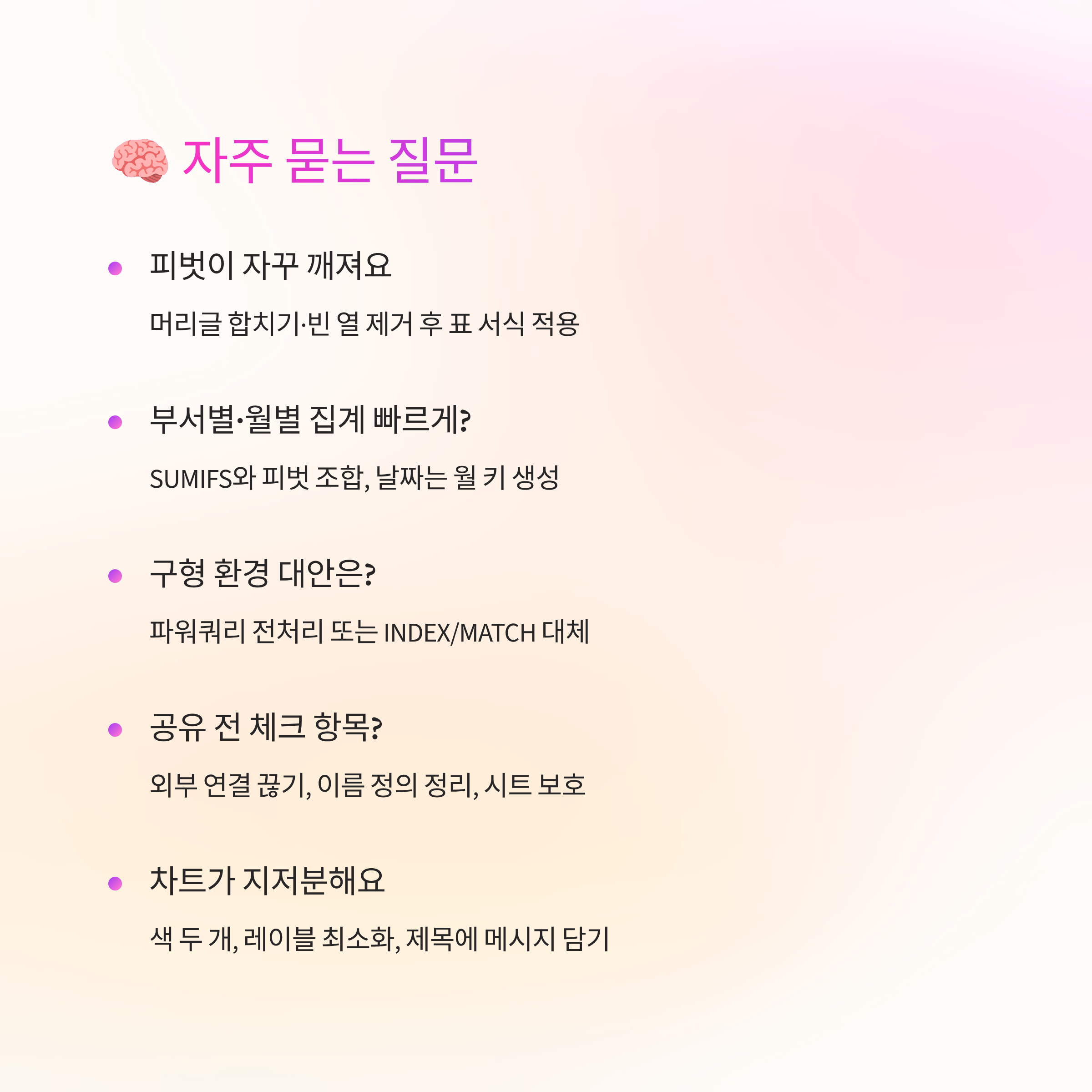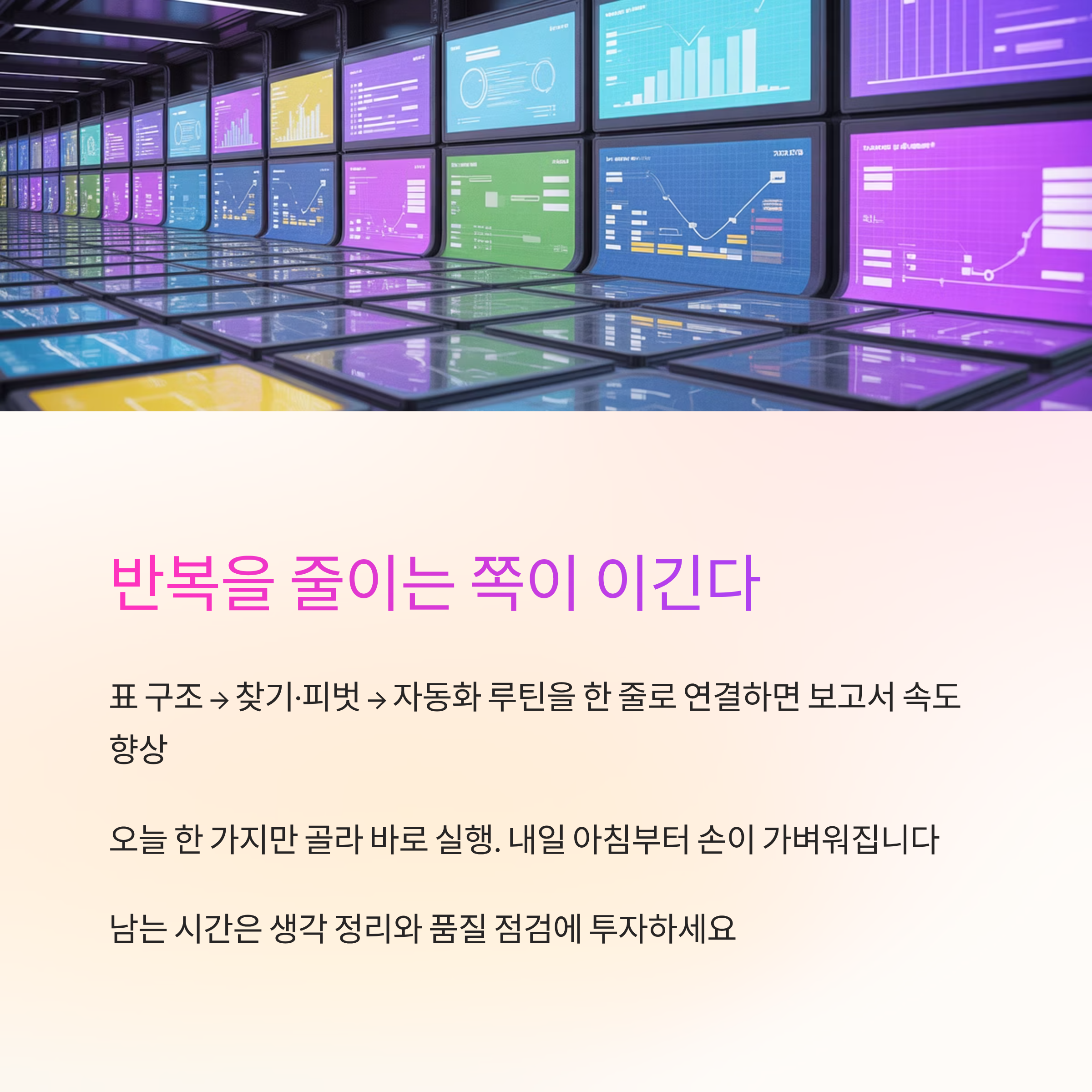 결국 일은 반복을 줄이는 쪽이 이기더라고요. 표만 제대로 세워 놓고, 찾기·피벗·자동화 루틴을 한 줄로 연결하면 보고서가 훨씬 빨리 끝나요. 오늘 내용에서 한 가지만 골라 바로 만들어 보세요. 내일 아침부터 손이 훨씬 가벼워질 거예요. 남는 시간은 생각 정리와 품질 점검에 쓰면, 결과물도 자연스럽게 올라가요.