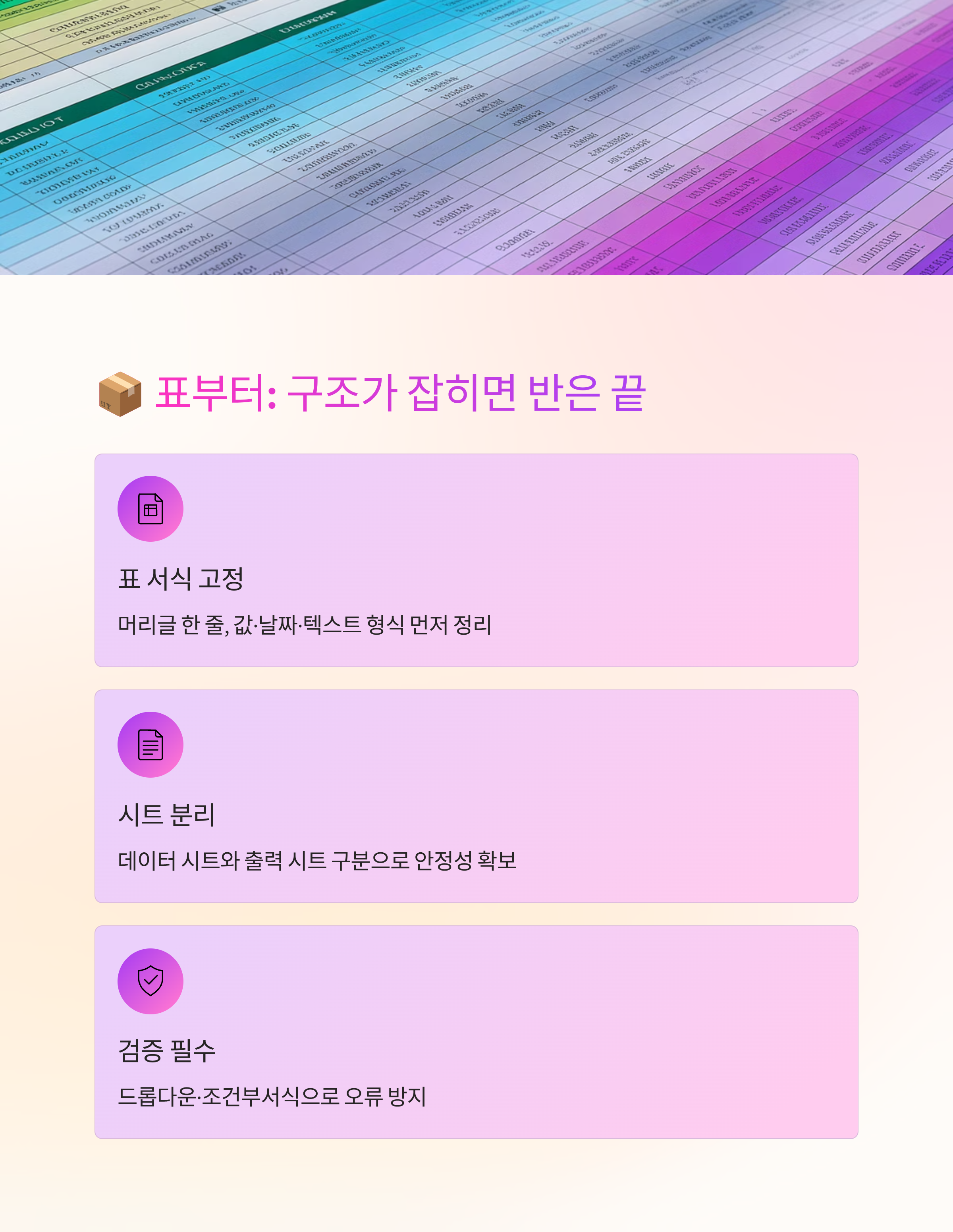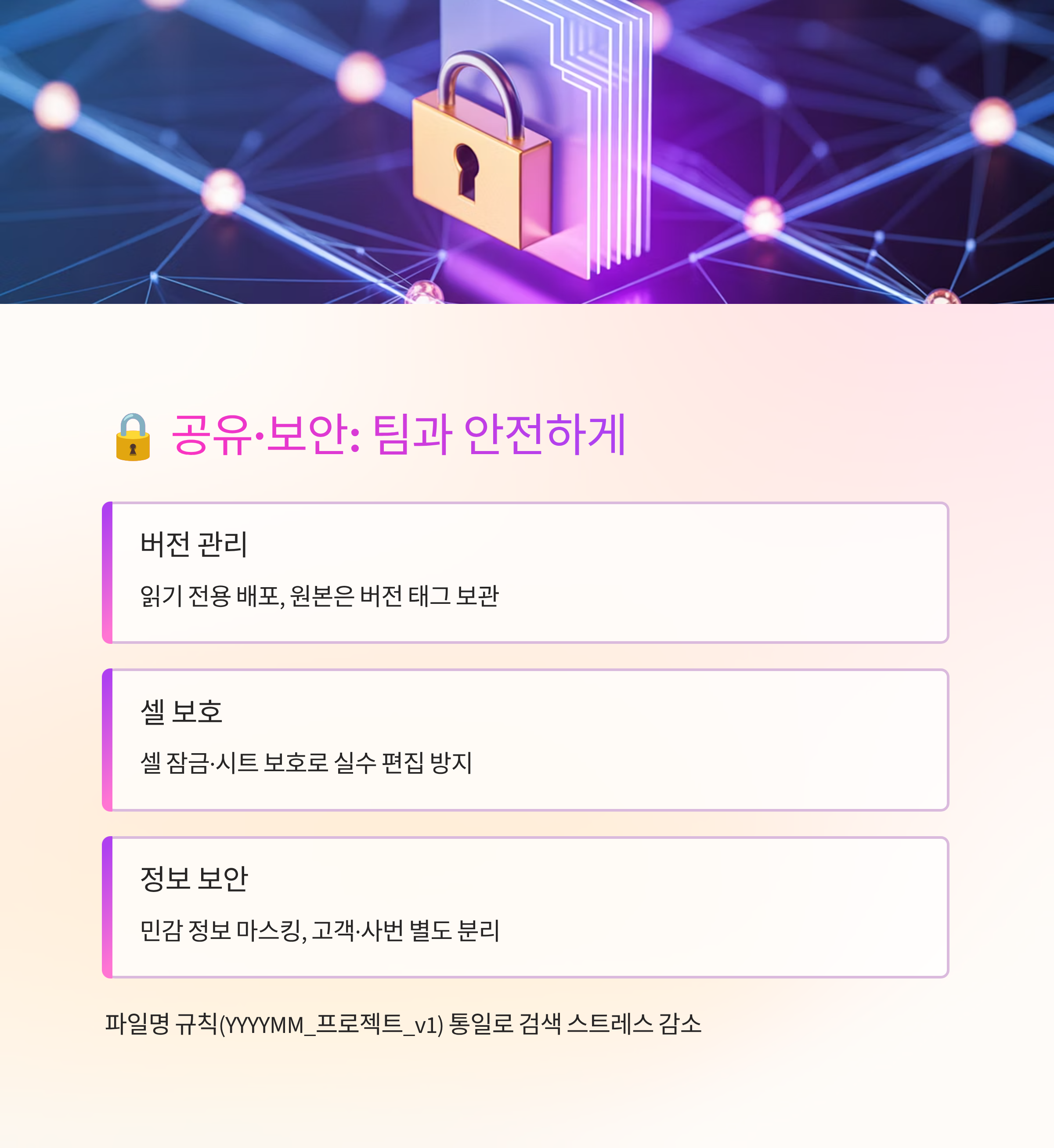 데이터 시트와 출력 시트를 분리하는 것도 포인트예요. 원본은 손대지 않고, 보고용 시트에서만 정렬·서식을 건드리면 안정감이 커져요. 입력칸엔 연한 색을 칠해 동료가 어디를 수정해야 하는지 바로 보이게 만들고요.