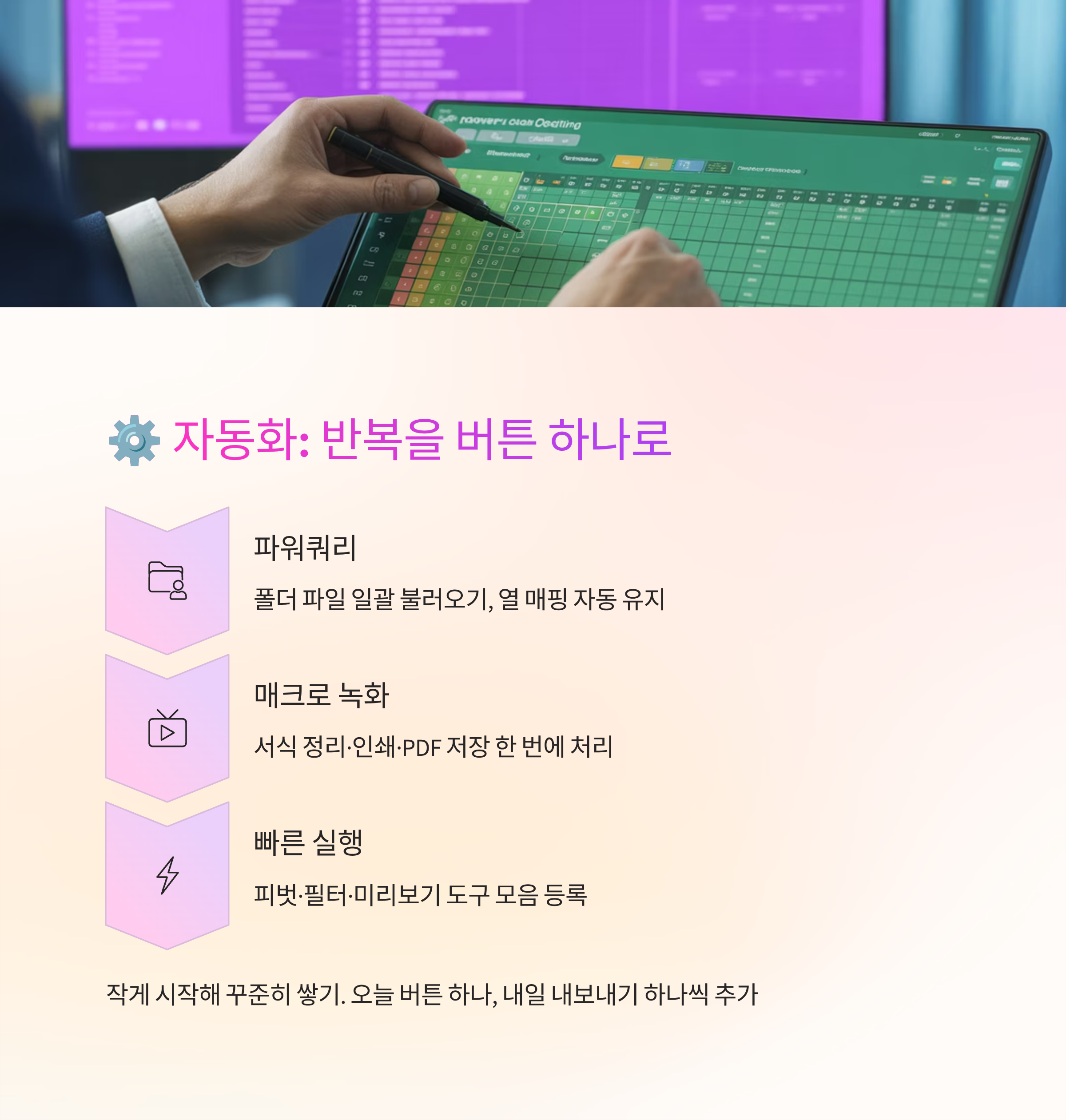 파워쿼리는 폴더 안 파일을 한 번에 불러오고, 열 이름이 바뀌어도 매핑을 유지해줘서 월말 보고에 최강이에요. 새 파일만 추가하고 ‘새로 고침’ 누르면 끝나니까 실수가 줄죠. 매크로는 녹화로 시작해 서식 정리·인쇄 배율·PDF 저장을 한 번에 묶어두면 야근을 줄여줘요.