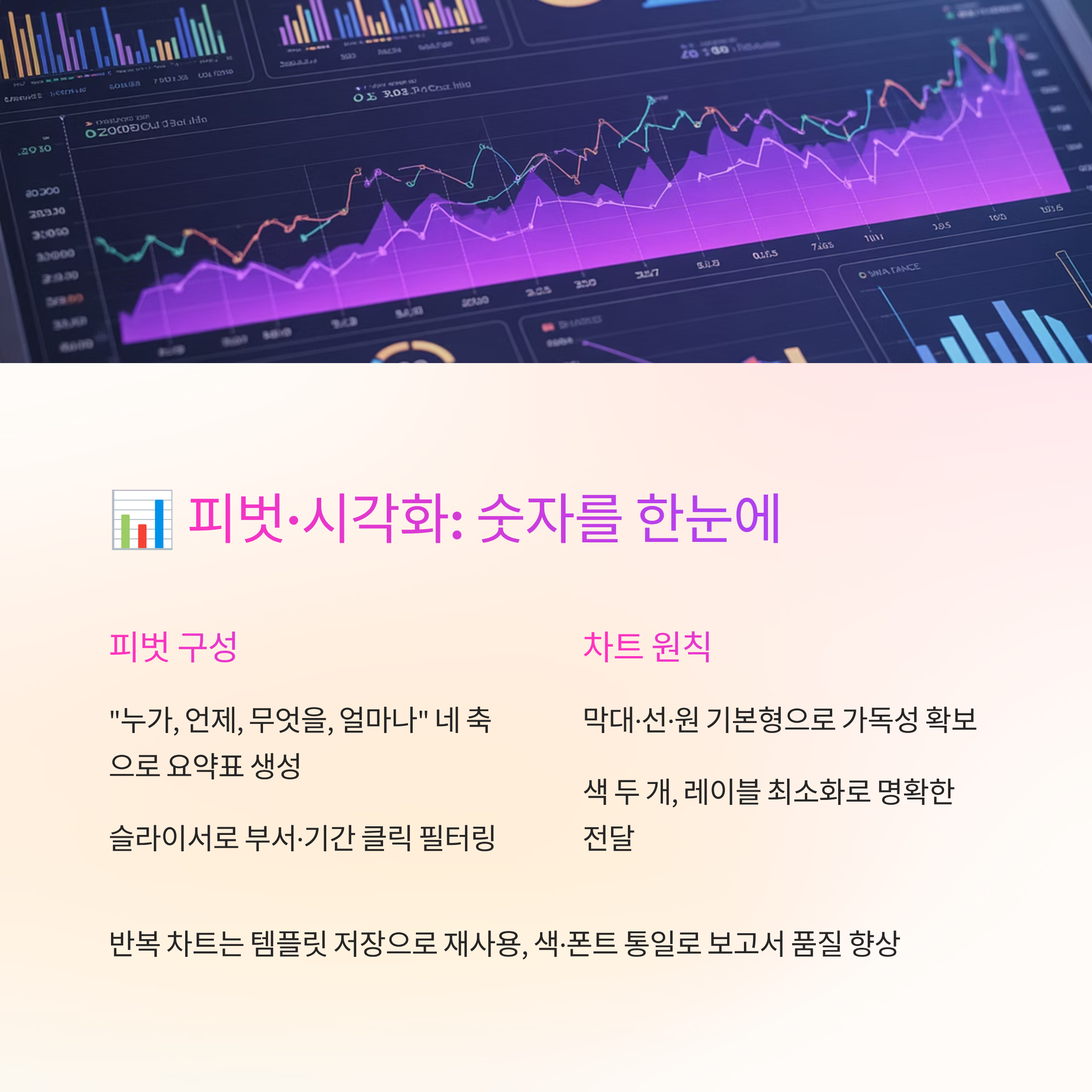 피벗은 열이 아닌 질문으로 생각하면 쉬워요. “누가, 언제, 무엇을, 얼마나” 이 네 가지 축만 잘 끼우면 요약표가 금방 나와요. 값 필드 설정에서 표시 형식을 퍼센트·누계로 바꾸면 인사이트가 또렷해지고요. 슬라이서를 얹어 부서·기간을 클릭으로 바꾸게 만들면 회의가 빨라져요.