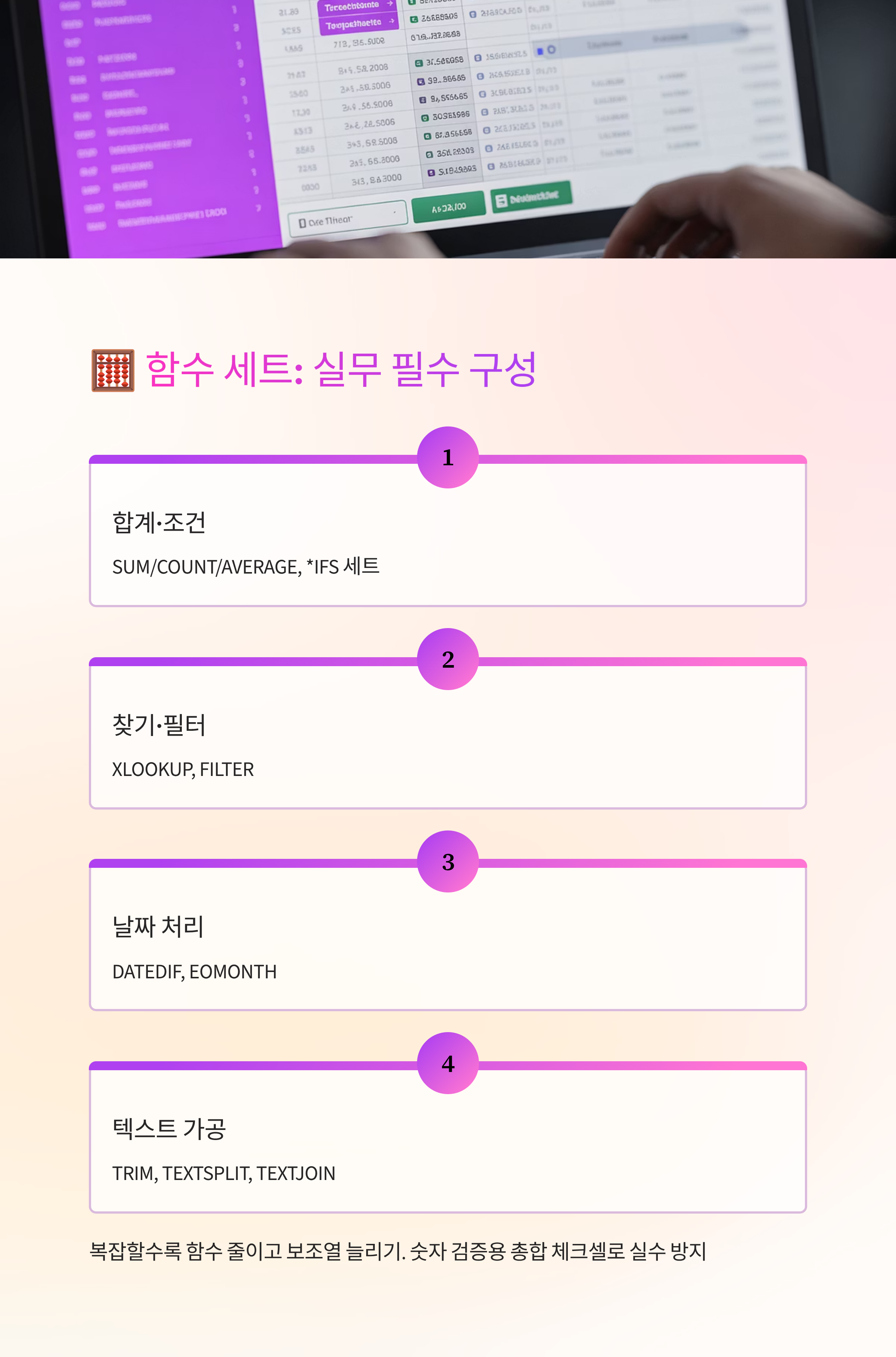 합계·조건 합계(SUM/COUNT/AVERAGE, *IFS 세트), 찾기(XLOOKUP), 필터(FILTER), 날짜(DATEDIF, EOMONTH), 텍스트(TRIM, TEXTSPLIT, TEXTJOIN)만 익혀도 웬만한 보고는 다 됩니다. 복잡해질수록 함수는 줄이고 보조열을 늘리면 디버깅이 쉬워요. 숫자 표시는 TEXT로 포맷을 분리하면 정렬이 어긋나지 않아요. 이런 구성만 유지해도 직장인을위한실무엑셀 작업이 안정적으로 굴러가요.