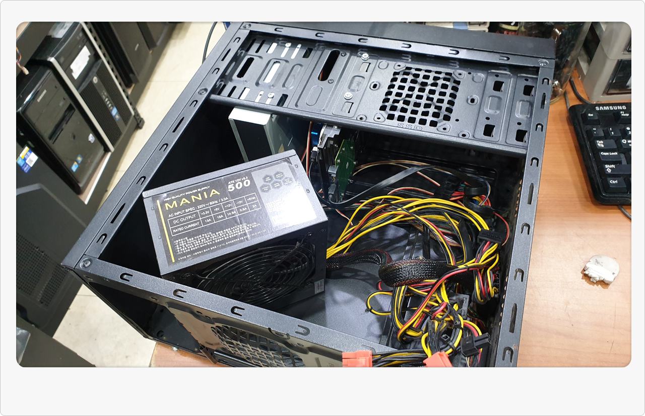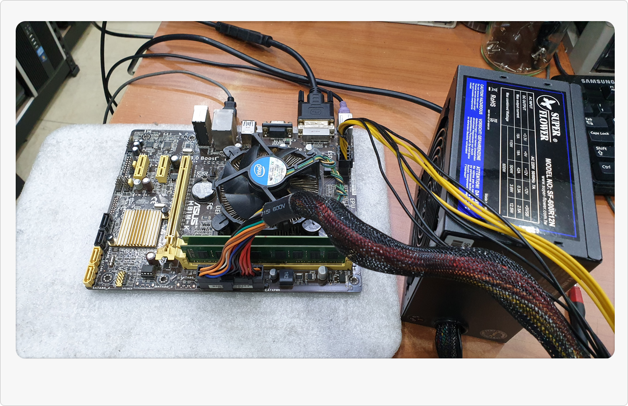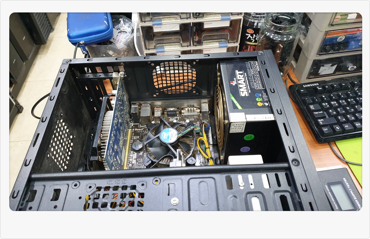이번 본체도 실질적으로 손주분들이 게임을 즐기는 용도라고 하셨는데, 워낙 오래된 부품이라 성능을 크게 높일 필요는 없어 보였습니다. 대신 중고 메인보드를 골라 적당히 교체하고, 추가로 파워 상태나 램 모듈도 살펴보니 큰 문제는 없더군요. 예전에 액정 교체나 외장하드 복구 같은 작업을 해드린 적도 있는데, 이처럼 용도에 맞춰 과도한 비용이 들지 않도록 조정해 드리는 게 저희가 중요하게 여기는 부분입니다.