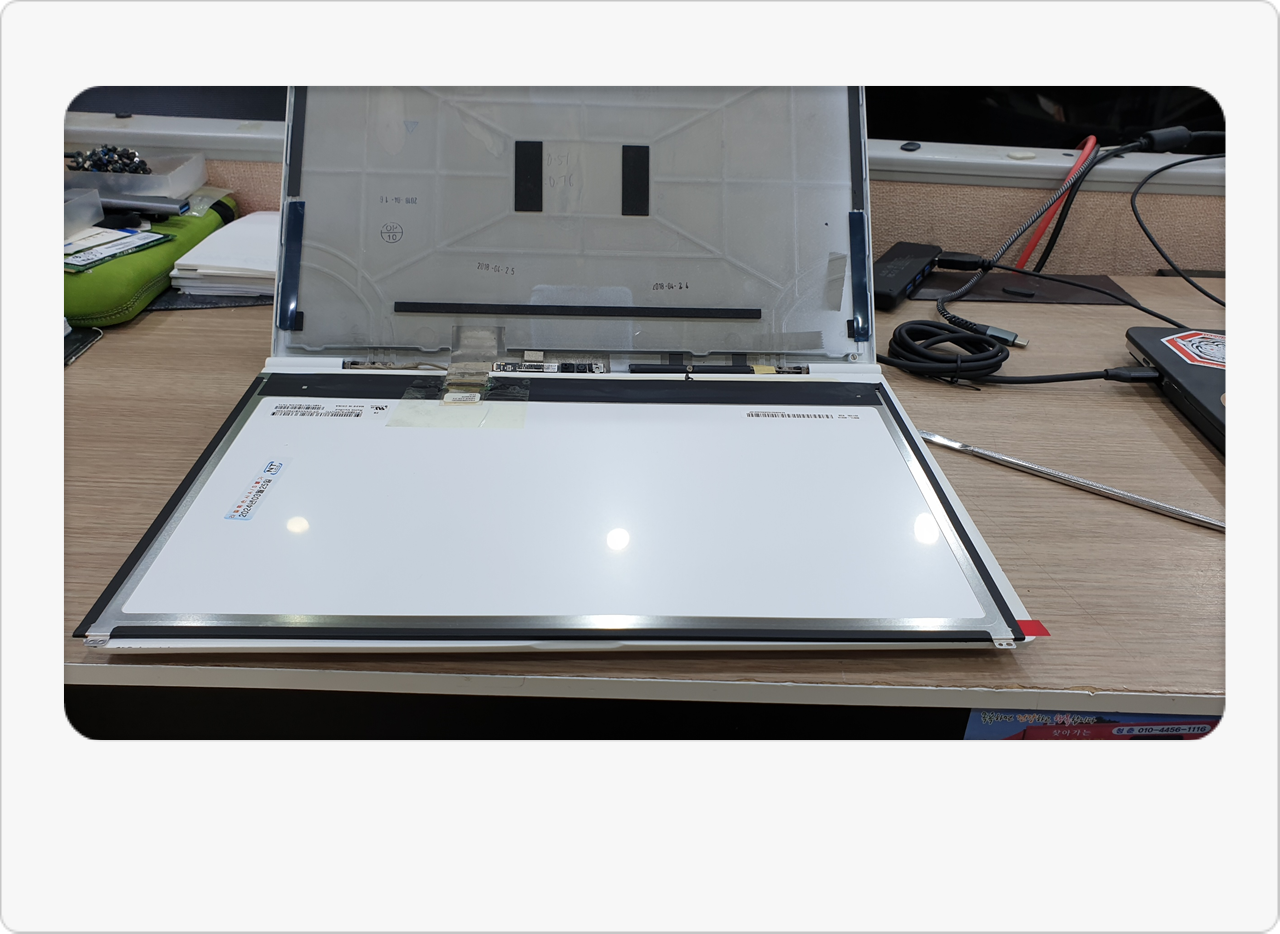 이처럼 “청주노트북액정수리”가 필요한 경우에는, 화면을 통째로 갈아야 하는 상황이 대부분입니다. 하지만 충격이 심한 경우 케이블이나 메인보드도 함께 망가지는 사례를 종종 봤어요. 그래서 매장에서는 액정만 교체해도 되는지, 아니면 다른 부분 수리도 필요한지 빠르게 구분해 드리려고 힘씁니다. 이번 LG 노트북은 다행히 액정 자체만 크게 파손됐고, 내부 케이블이나 힌지에는 추가 손상이 없었어요. 고객님께 하루라도 빨리 작업을 마치고 싶으시다면, 재고가 확보되어 있으니 당일 교체도 가능하다고 안내해 드렸습니다.