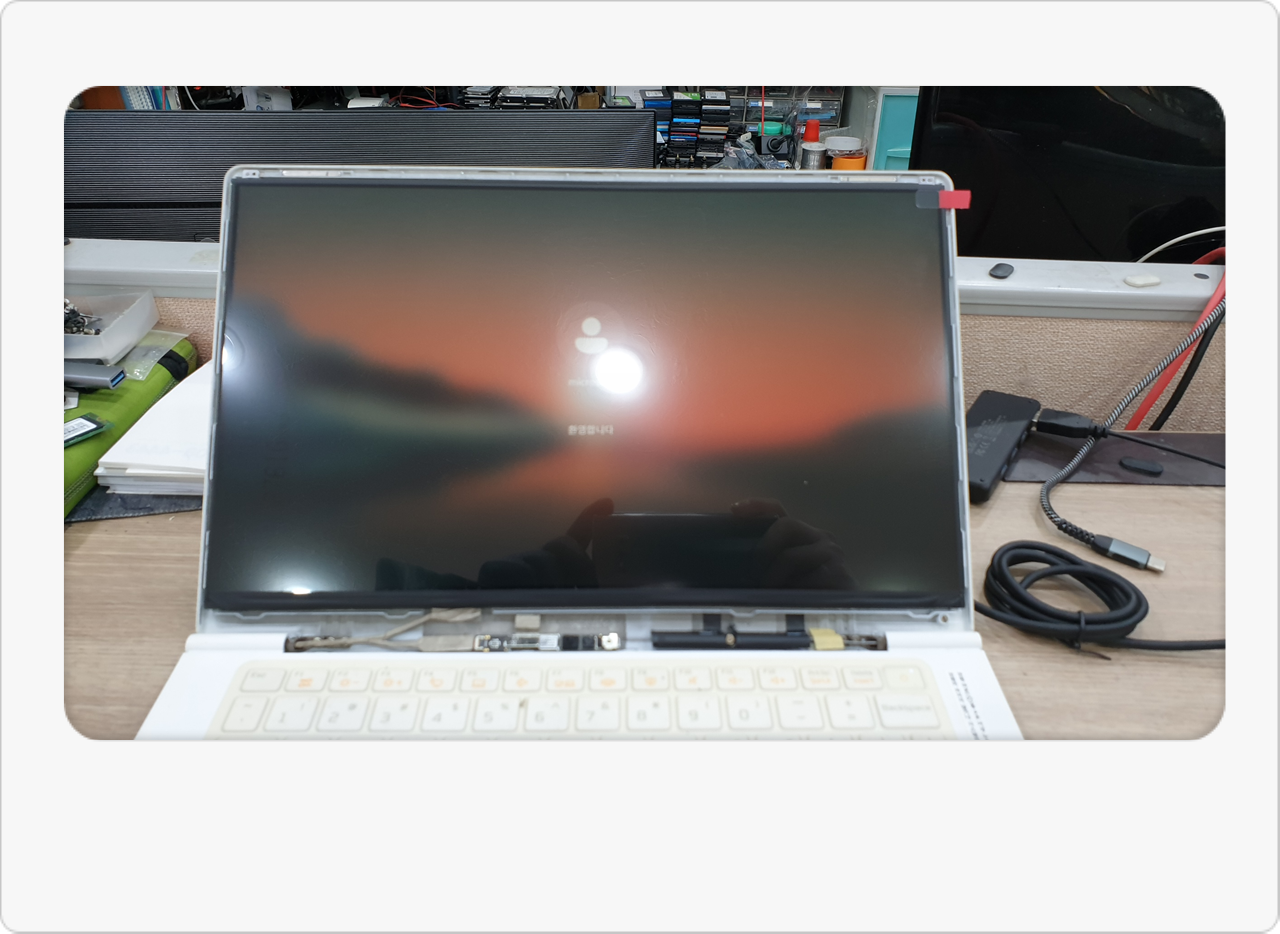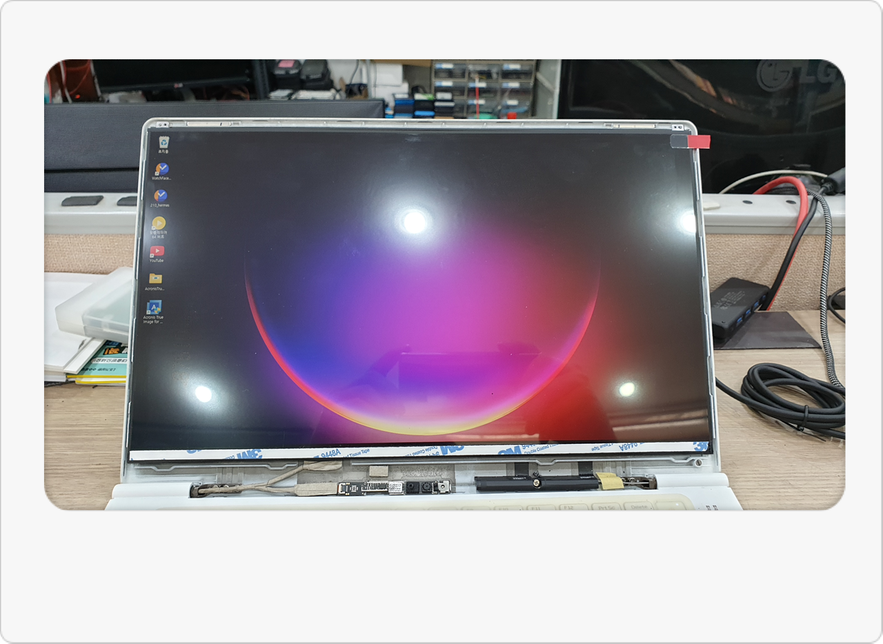그날도 마침 LG 노트북 액정 재고가 있어서, 내부 분해부터 교체 작업까지 일사천리로 진행했습니다. 사진으로 남겨둔 화면을 살펴보면, 노트북 하단 케이스를 분리하고 배선 상태를 확인하는 모습이 담겨 있죠. 가끔 경첩 부근이 어긋나 있거나 연결부가 손상된 기종도 있어서, 그냥 액정만 바꾸는 걸로 끝나는 게 아닐 때도 있습니다. 다행히 이번 모델은 교체 난도가 높지 않았고, 교체 후 부팅해보니 화면이 깔끔하게 들어오더군요. 고객님은 잠시 놀라신 듯하다가 “이렇게 간단히 해결될 줄 몰랐다”고 연신 웃으셨어요.
