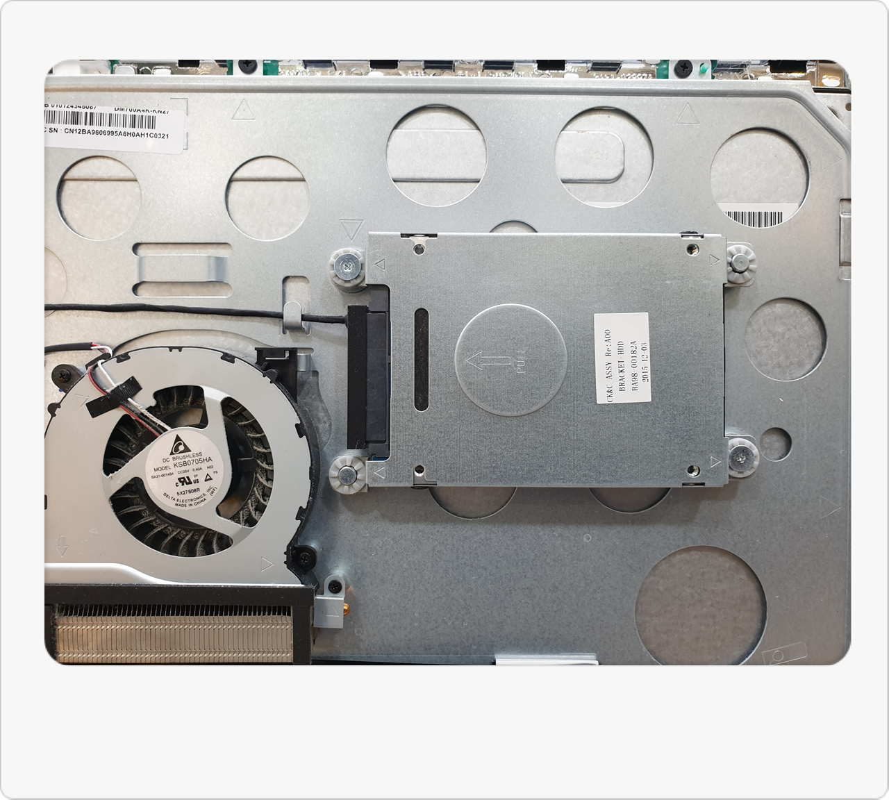 내부를 살펴보니 예상대로 일반 HDD(하드디스크)가 장착된 상태였어요. 이 시기 출시된 올인원PC는 HDD 탑재 비율이 높아서, 시간이 지날수록 점점 속도가 느려지는 문제가 흔합니다. 저 역시 이런 사례를 많이 봐왔기 때문에, 가장 즉각적인 해결책으로 SSD 교체를 권해드렸습니다. 특히 올인원PC는 부품 교체 폭이 제한적이라, HDD → SSD 교체만으로도 눈에 띄는 속도 향상을 기대할 수 있거든요.