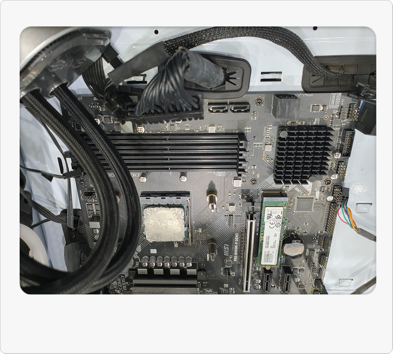 하지만 이분의 컴퓨터는 그런 간단한 문제로 해결되지 않았습니다. 메모리나 그래픽카드를 교체해봐도 똑같이 윈도우 설치 오류가 뜨는 겁니다. 그래서 CPU나 메인보드 쪽에 이상이 있는지 더 깊이 살펴봤죠. 혹시 CPU가 과열되거나 고정 상태가 불안정할 수도 있다는 생각에 쿨러를 다시 장착해보고, 발열 상태도 확인했는데 별다른 이상은 발견되지 않았어요. SSD 역시 정상으로 인식되는 걸 보니 저장장치 결함도 아니라는 결론이 나왔습니다.