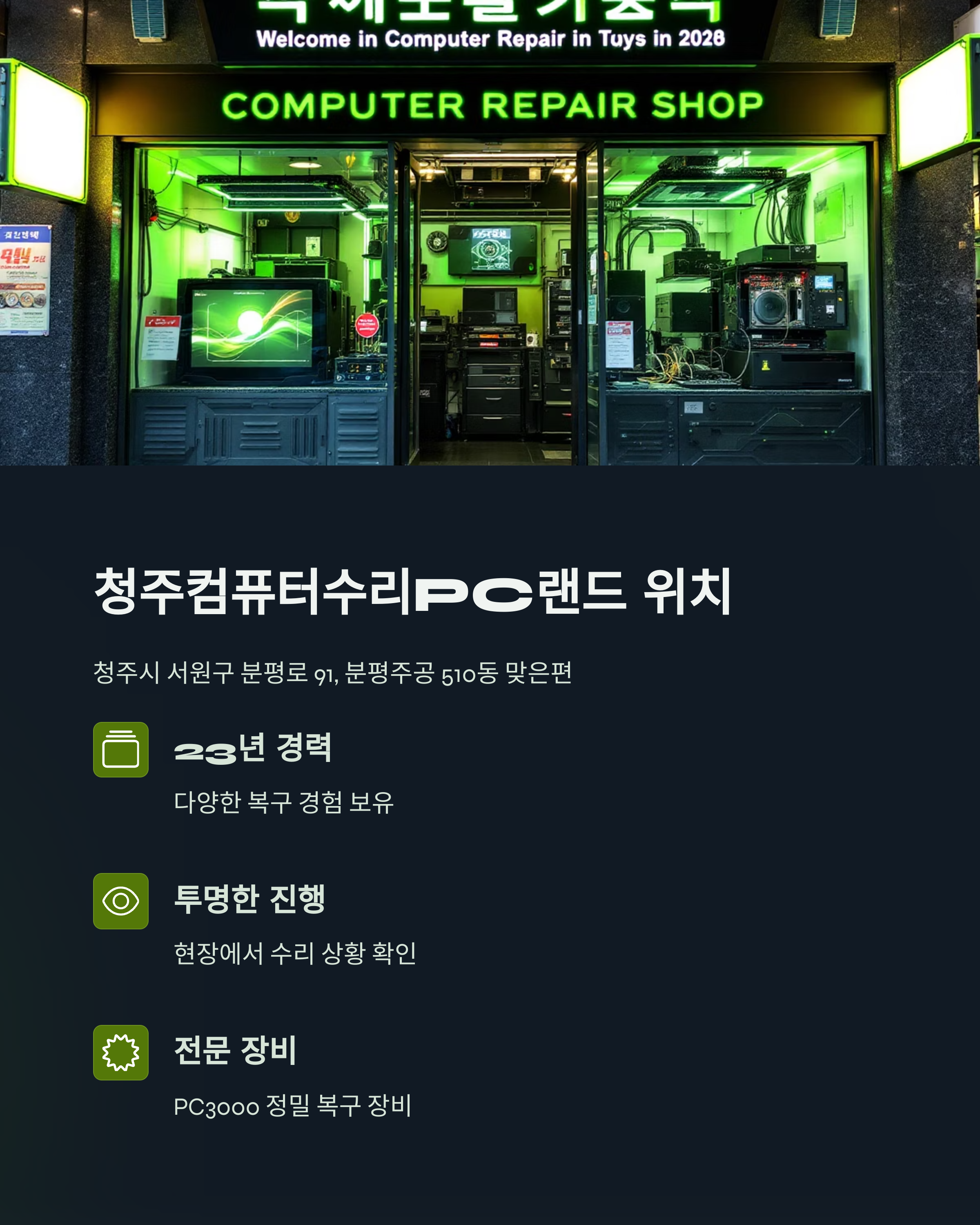 저희 청주컴퓨터수리PC랜드는 청주시 서원구 분평로 91, 분평주공 510동 맞은편에 있습니다. 23년간 다양한 컴퓨터 문제를 해결해오며, 외장하드복구도 수없이 진행해왔습니다. 특히 이번처럼 헤드 손상 등 하드웨어 복구가 필요한 경우는 더욱 세심한 기술이 요구됩니다. 현장에서 수리 상황을 직접 확인하실 수 있도록 투명하게 진행해드리고 있어요. 어떤 문제가 있든, 청주 외장하드복구는 여러분의 데이터를 안전하게 지켜드립니다.