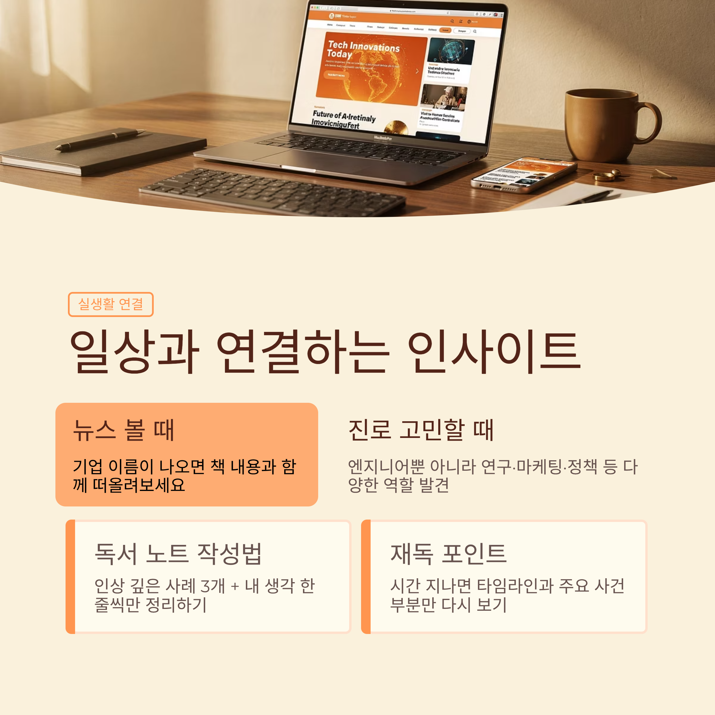 책을 다 읽고 나면 그냥 "재밌었다"에서 끝내기보다는, 내 일상과 어떻게 연결할 수 있을지 한 번쯤 생각해 보면 훨씬 오래 기억에 남아요. 예를 들어 지금 쓰고 있는 스마트폰이나 노트북 안에 어떤 회사의 기술이 들어가 있을지 상상해 보는 것만으로도 시야가 확 넓어지거든요. 뉴스에서 특정 기업 이름이 나올 때도 이 책에서 봤던 내용이 같이 떠올라서 이해가 더 쉽게 돼요.