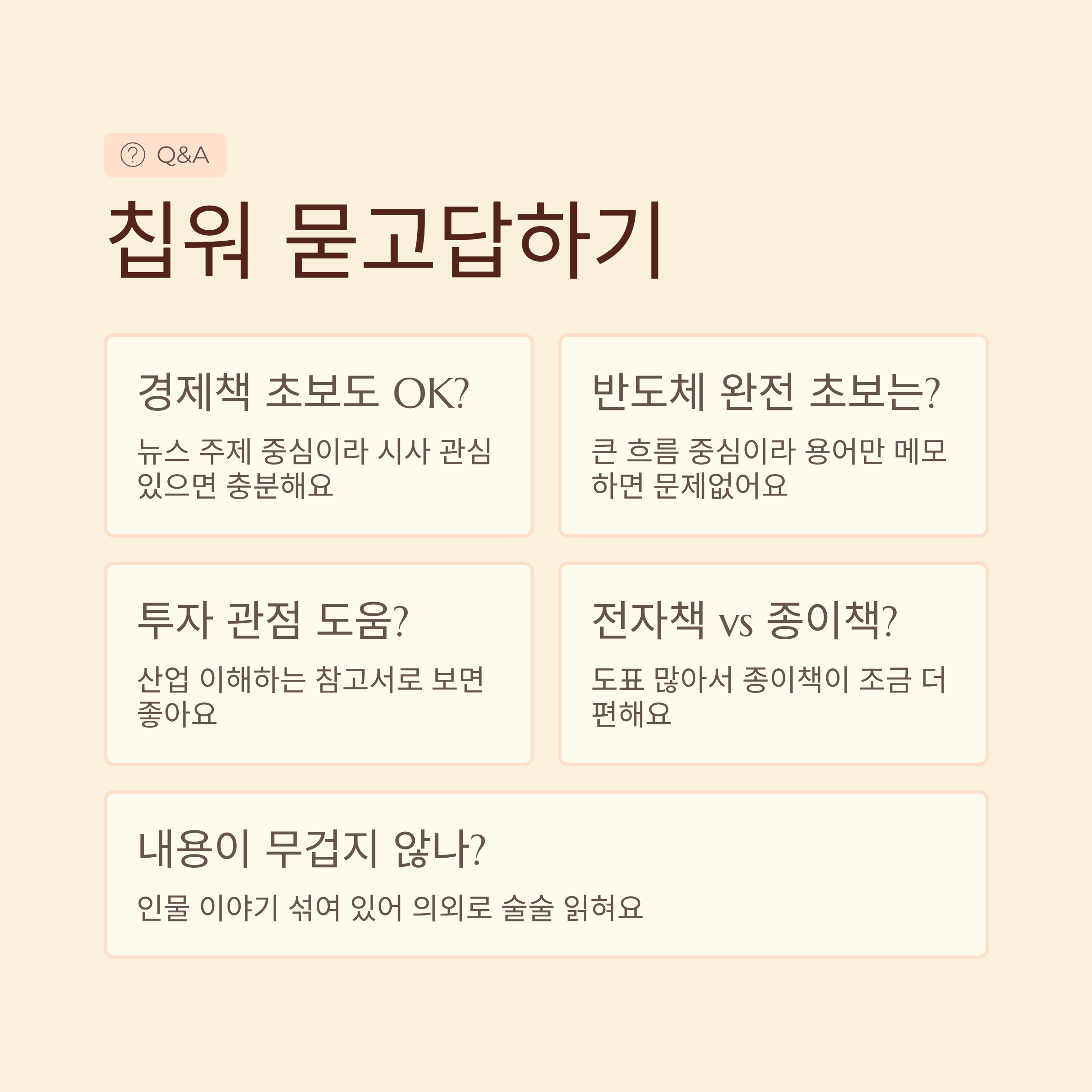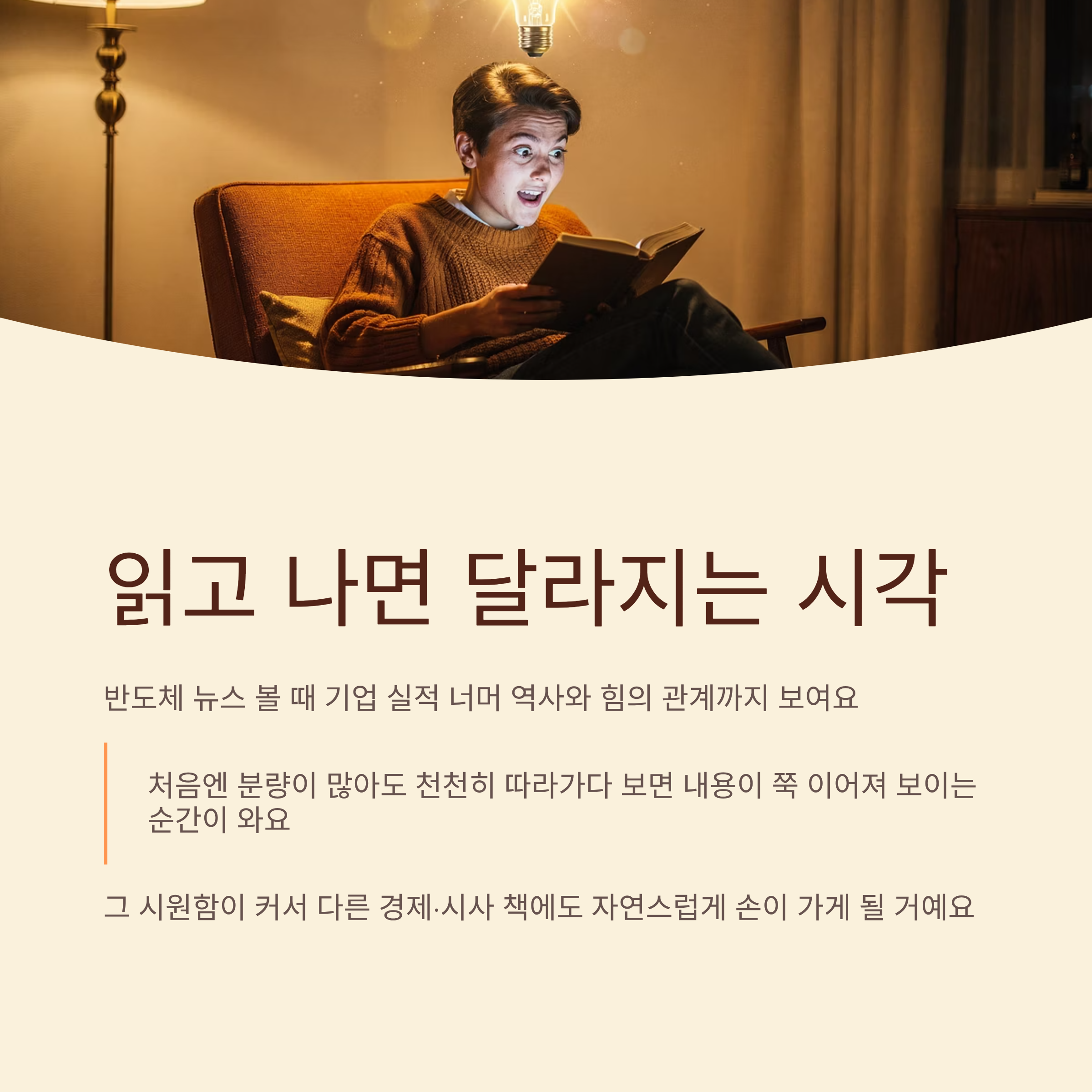 이 책을 한 번 통과하고 나면 반도체 뉴스나 기술 기사 볼 때 느낌이 정말 달라져요. 예전에는 단순히 기업 실적이나 주가 정도만 보였다면, 이제는 그 뒤에 깔린 역사와 힘의 관계까지 같이 떠오르거든요. 물론 처음엔 분량도 많고 낯선 용어도 많아서 쉽게 잡히지 않을 수 있지만, 오늘 정리한 흐름대로 천천히 따라가다 보면 어느 순간 내용이 쭉 이어져 보이는 순간이 와요. 그때 느껴지는 시원함이 꽤 커서, 다른 경제·시사 책에도 자연스럽게 손이 가게 되실 거예요.