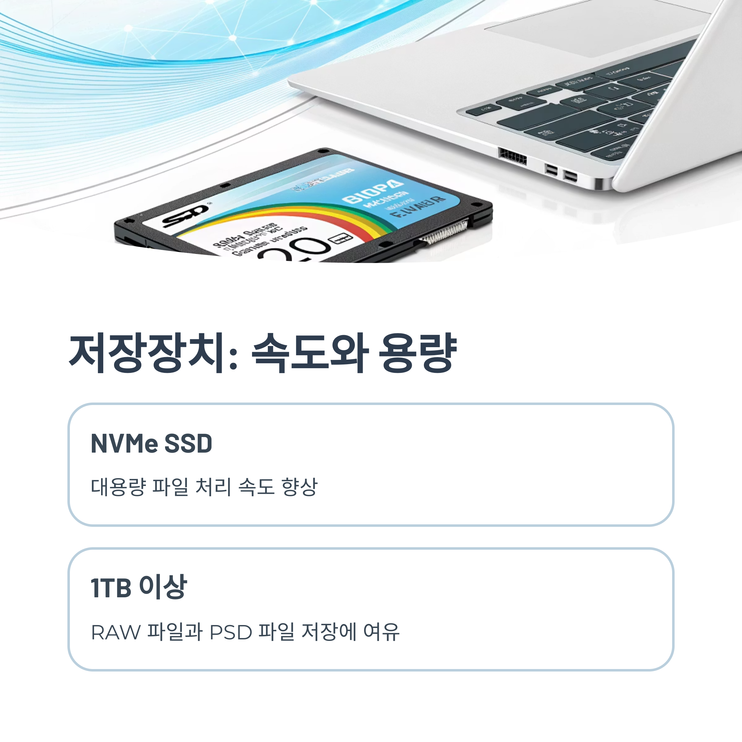 그리고 파일 저장뿐 아니라 캐시 작업도 저장장치에서 일어나기 때문에, 속도가 느린 저장장치를 쓰면 전체 퍼포먼스에 영향을 줄 수 있어요. 포토샵용노트북에서 이 점은 꼭 고려해야 하는 부분 중 하나예요.