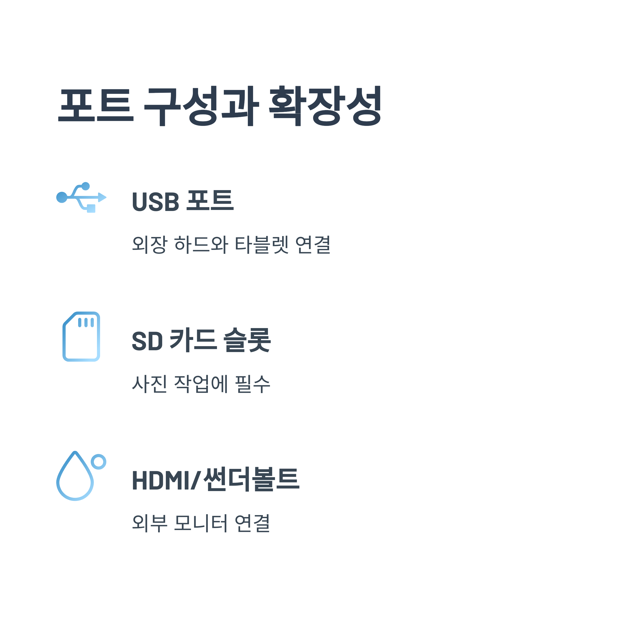 특히 사진 작업하시는 분들이라면 SD 카드 슬롯 유무는 꼭 체크하셔야 해요. 없으면 매번 별도 리더기를 연결해야 하니까 꽤 번거롭거든요. HDMI 포트나 썬더볼트 포트 지원 여부도 다목적 활용을 생각하면 꼭 확인해봐야 할 부분이에요.