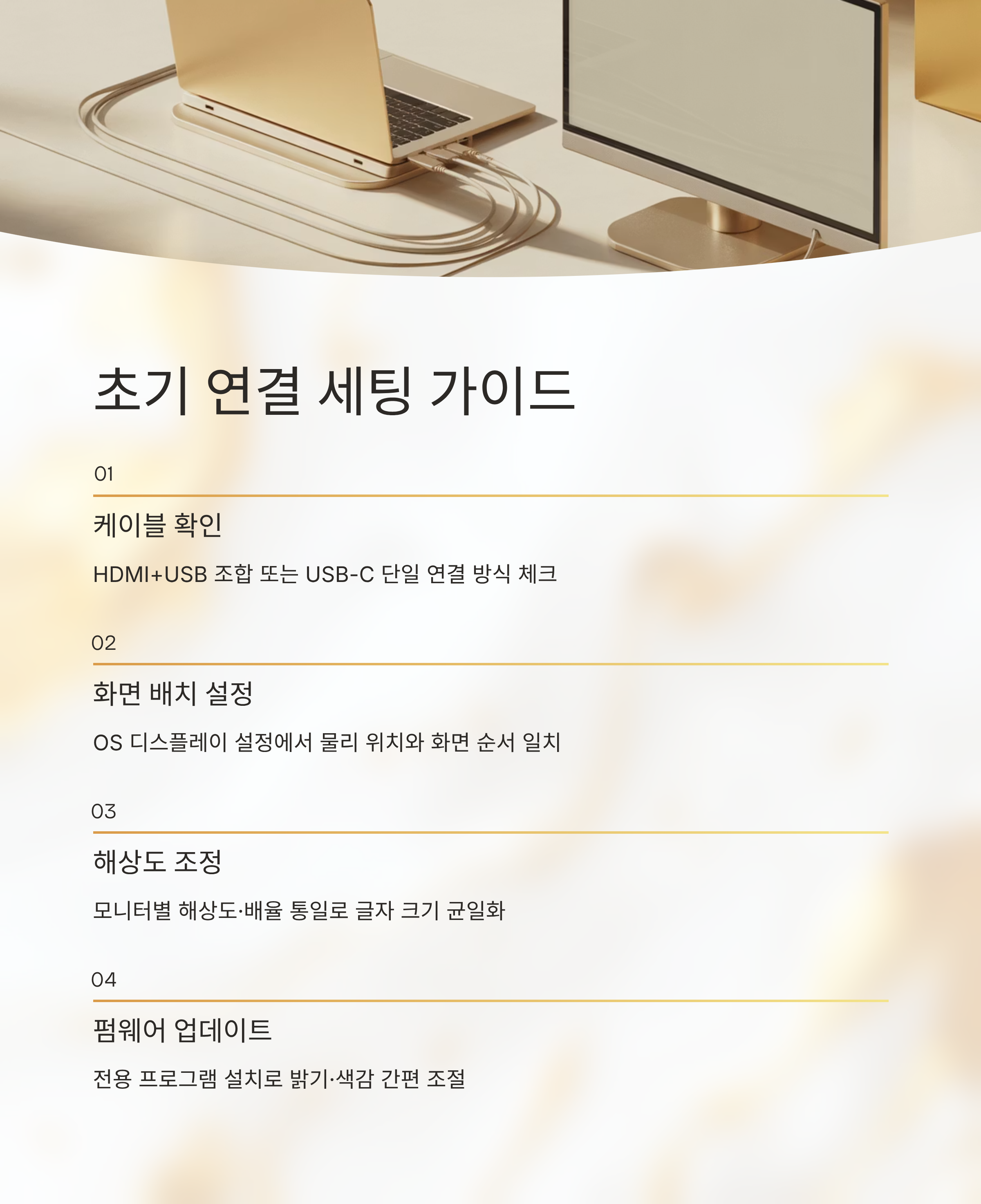 전용 프로그램이나 펌웨어 업데이트가 제공된다면, 설치 초기에 한 번은 꼭 확인해 보는 걸 추천해요. 밝기와 색감을 간단히 조절할 수 있는 유틸이 있는지, 화면 회전이나 단축키 지원이 되는지도 함께 체크해 두면 좋고요. 이런 세팅을 한 번만 세심하게 잡아두면, 이후에는 케이블만 연결해도 바로 원하는 환경이 복원되기 때문에, 플립뷰 같은 듀얼스크린 장비를 훨씬 가볍게 꺼내 쓰게 돼요.
