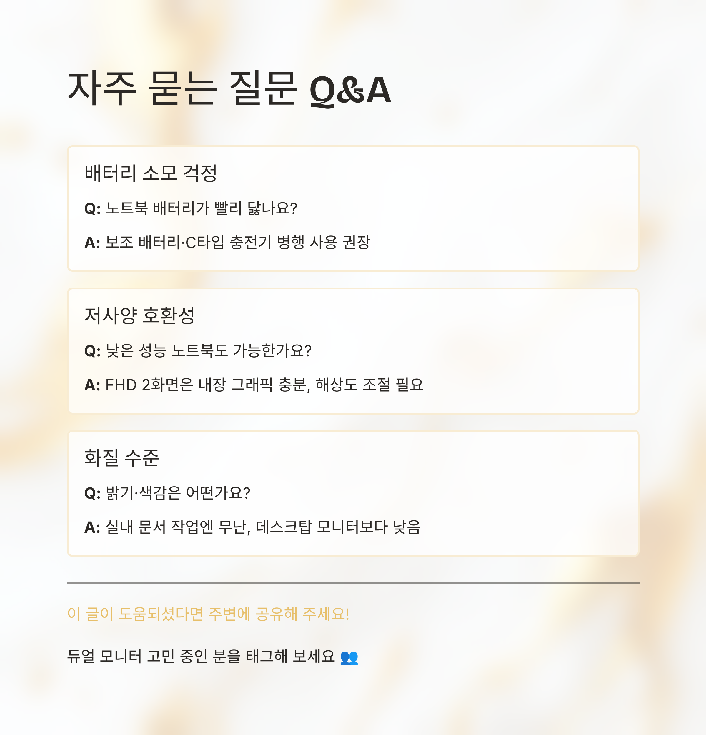 화면이 하나에서 셋으로 늘어나는 경험은 단순히 공간이 넓어진다는 느낌을 넘어서, 하루를 쓰는 방식 자체를 슬쩍 바꿔주는 것 같아요. 창 전환에 쓰이던 시간과 에너지를 줄이고, 눈앞에 필요한 정보들이 동시에 펼쳐져 있으면 같은 일을 해도 훨씬 덜 지치더라고요. 물론 새로운 장비를 들이는 일은 언제나 비용과 무게를 함께 데려오지만, 그만큼의 여유와 집중력을 되돌려 준다면 충분히 고민해 볼 가치는 있다고 느껴요. 오늘 정리한 내용들이 여러분이 쓰는 노트북 환경을 한 번 돌아보면서, 진짜로 필요한 화면은 무엇인지 천천히 생각해 보는 계기가 되었으면 해요.