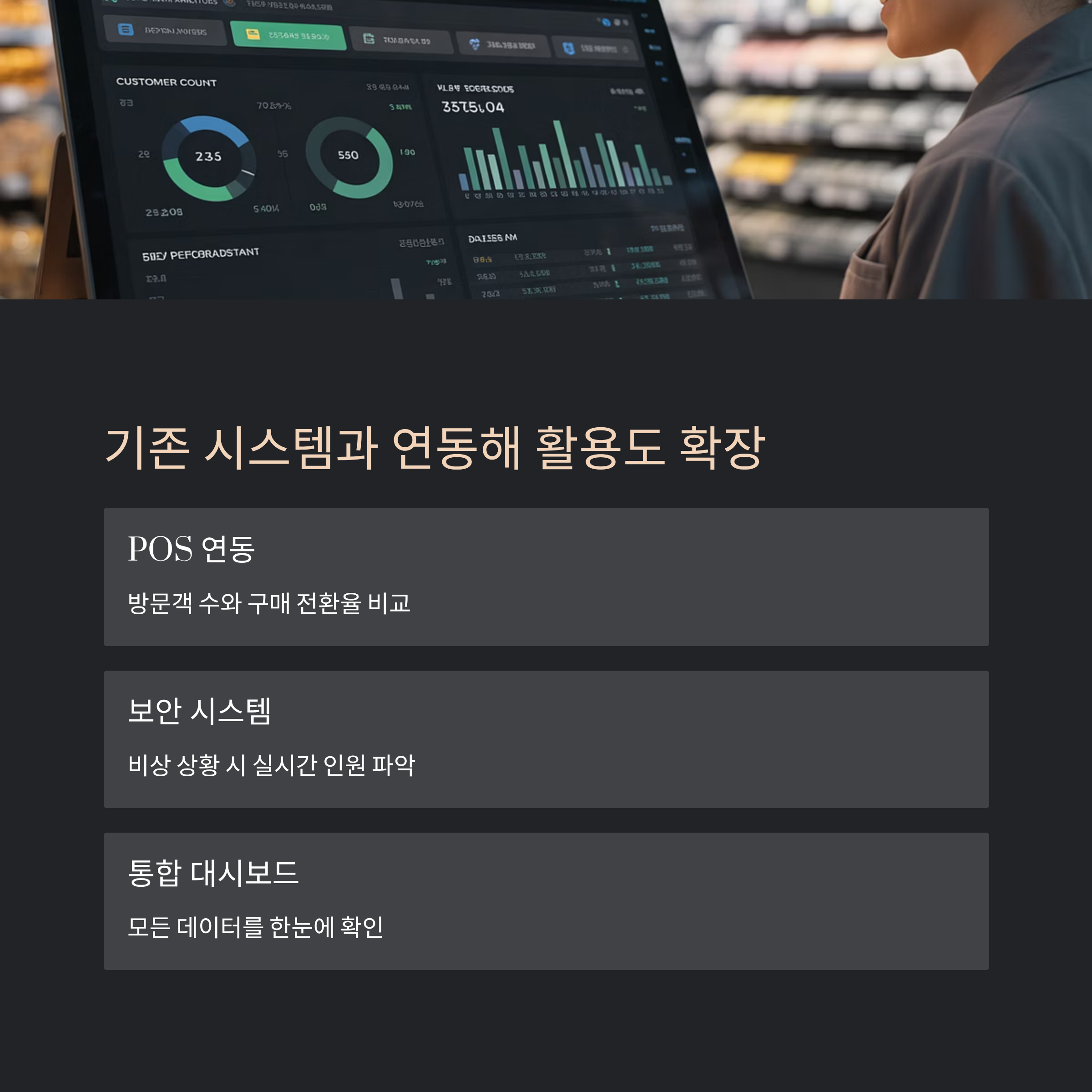 단독으로 사용해도 좋지만, POS, CRM 같은 기존 시스템과 연동하면 훨씬 더 가치 있는 분석이 가능합니다. 예를 들어, 방문객 수와 실제 구매 전환율을 비교해 마케팅 전략을 조정할 수 있습니다. 어떤 요일에 고객은 많이 왔지만 실제 구매로 연결되지 않았는지 확인하면, 어떤 부분에서 고객 경험이 단절되고 있는지를 진단할 수 있어요. 이런 분석은 마케팅 효율을 크게 높여줍니다.