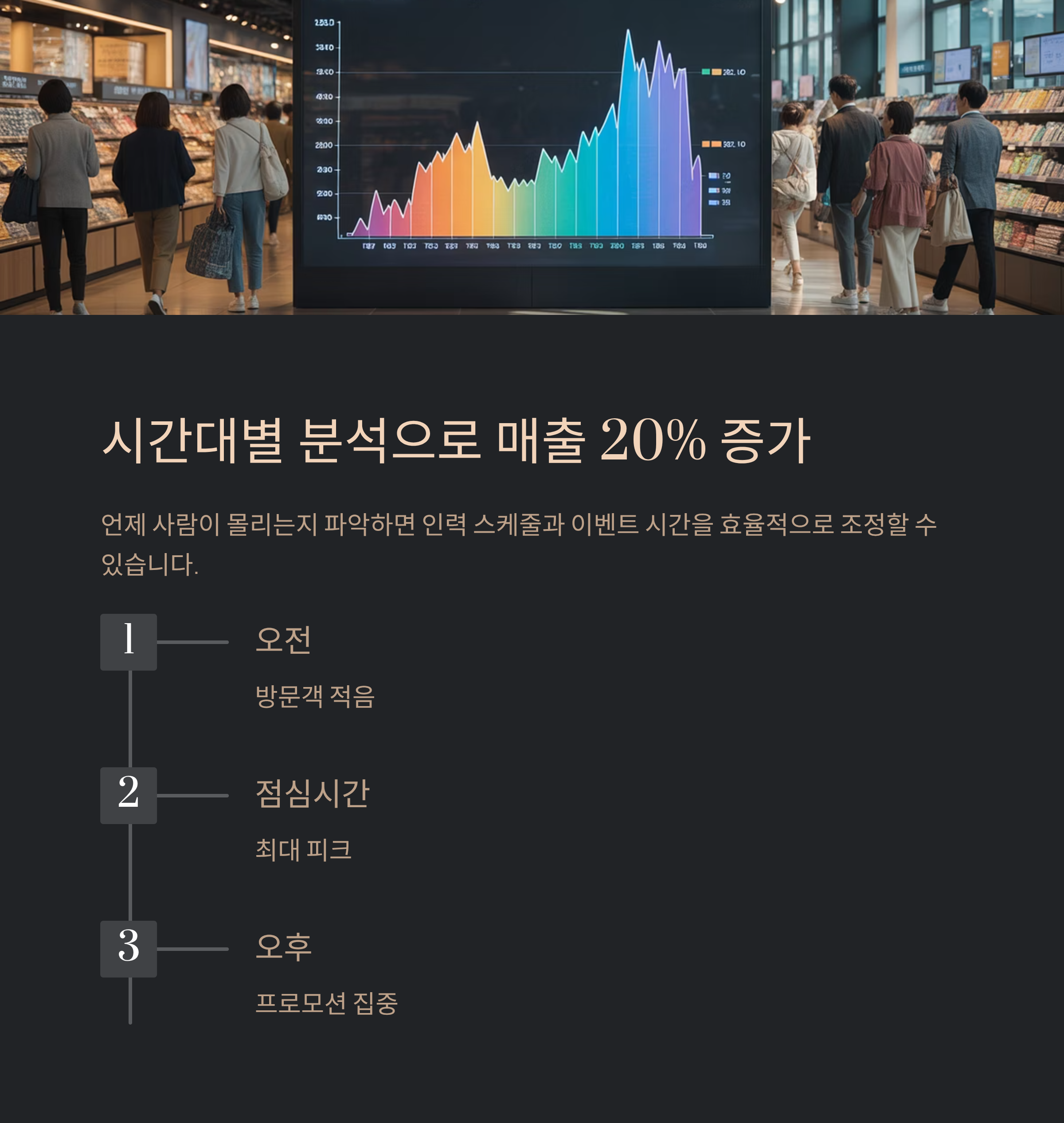 예를 들어, 오전보다는 오후에 방문객이 몰린다면 주요 프로모션을 오후에 배치하는 것이 효과적일 수 있습니다. 이는 고객 경험을 높이는 데도 큰 도움이 됩니다. 또한 시간대별 피크타임을 알면 인력 배치도 더 정밀하게 할 수 있죠. 특정 요일과 시간대에 항상 붐빈다면 그 구간만 인력을 더 배치해도 고객 대기 시간을 줄일 수 있습니다. 이런 작은 조정들이 전체 매장의 운영 품질을 좌우하게 됩니다.