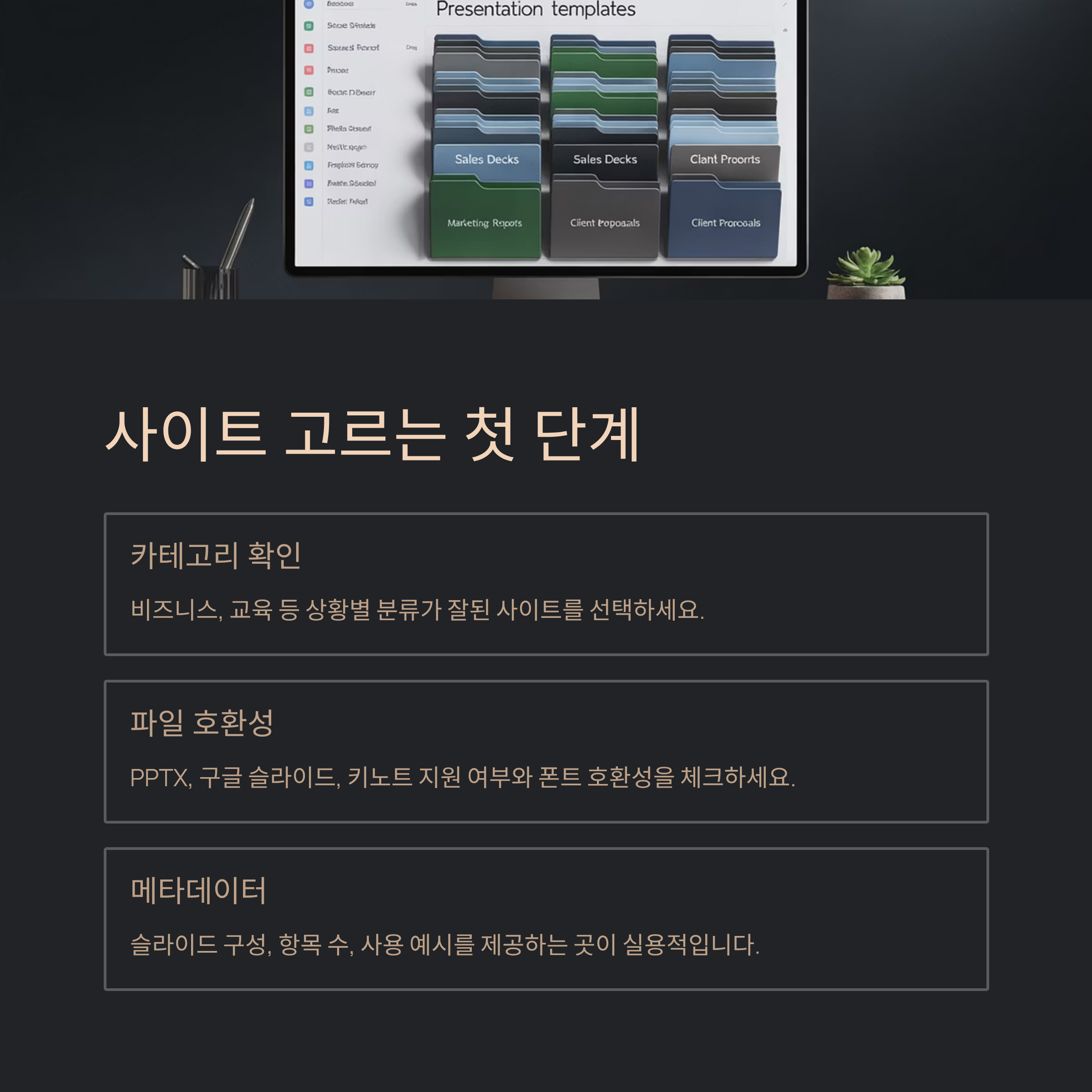 발표 날짜가 훅 다가오면 디자인보다 내용 정리에 집중하고 싶은데, 표지와 차트, 아이콘까지 직접 만들려면 금세 밤을 새우게 되죠. 그래서 템플릿을 찾으러 여기저기 돌아다니다 보면 사이트마다 스타일이 제각각이고, 라이선스 문구도 복잡해서 쉽게 손이 가지 않을 때가 많아요. 특히 회사 발표는 폰트·색상 가이드가 따로 있다 보니, 예쁜 샘플을 받아도 우리 브랜드와 충돌해 다시 처음으로 돌아가는 일이 잦아요. 사실 흐름만 잡으면 생각보다 간단해요. 발표 목적과 청중을 먼저 적고, 화면 비율과 색 팔레트를 정한 뒤, 그 기준에 맞는 템플릿만 추려 저장해 두면 시행착오가 확 줄거든요. 오늘은 그 순서로 사이트 고르는 기준, 무료·유료의 장단점, 라이선스 안전선, 실전 편집 팁, 팀 공유까지 싹 정리해 드릴게요. 읽고 나면 어떤 자료를 준비하든 마음이 한결 가벼워질 거예요.