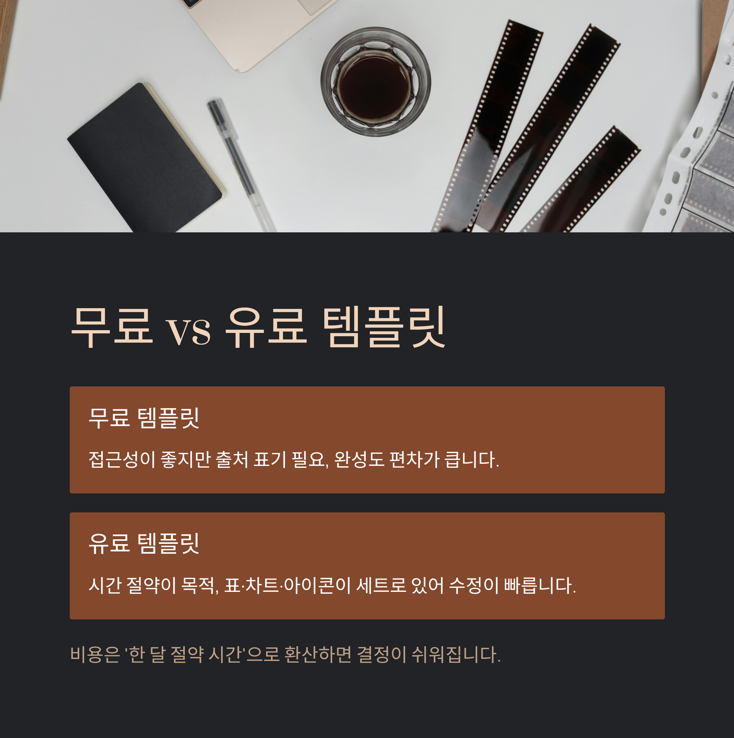 유료는 시간 절약이 목적이에요. 표·차트·아이콘이 세트로 있고, 마스터·레이어 구조가 깔끔해 수정이 빨라요. 구독형은 전체 라이브러리를 쓰는 대신 월 과금이고, 단건형은 필요한 템플릿만 사는 방식이라 가볍게 시작하기 좋아요. 팀이라면 좌석 수와 공유 정책, 상업적 이용 범위를 먼저 확인하는 게 좋아요. 구매 전 미리보기에서 페이지 수, 대체 색 스킴, 목차 슬라이드 제공 여부를 꼭 봐요.