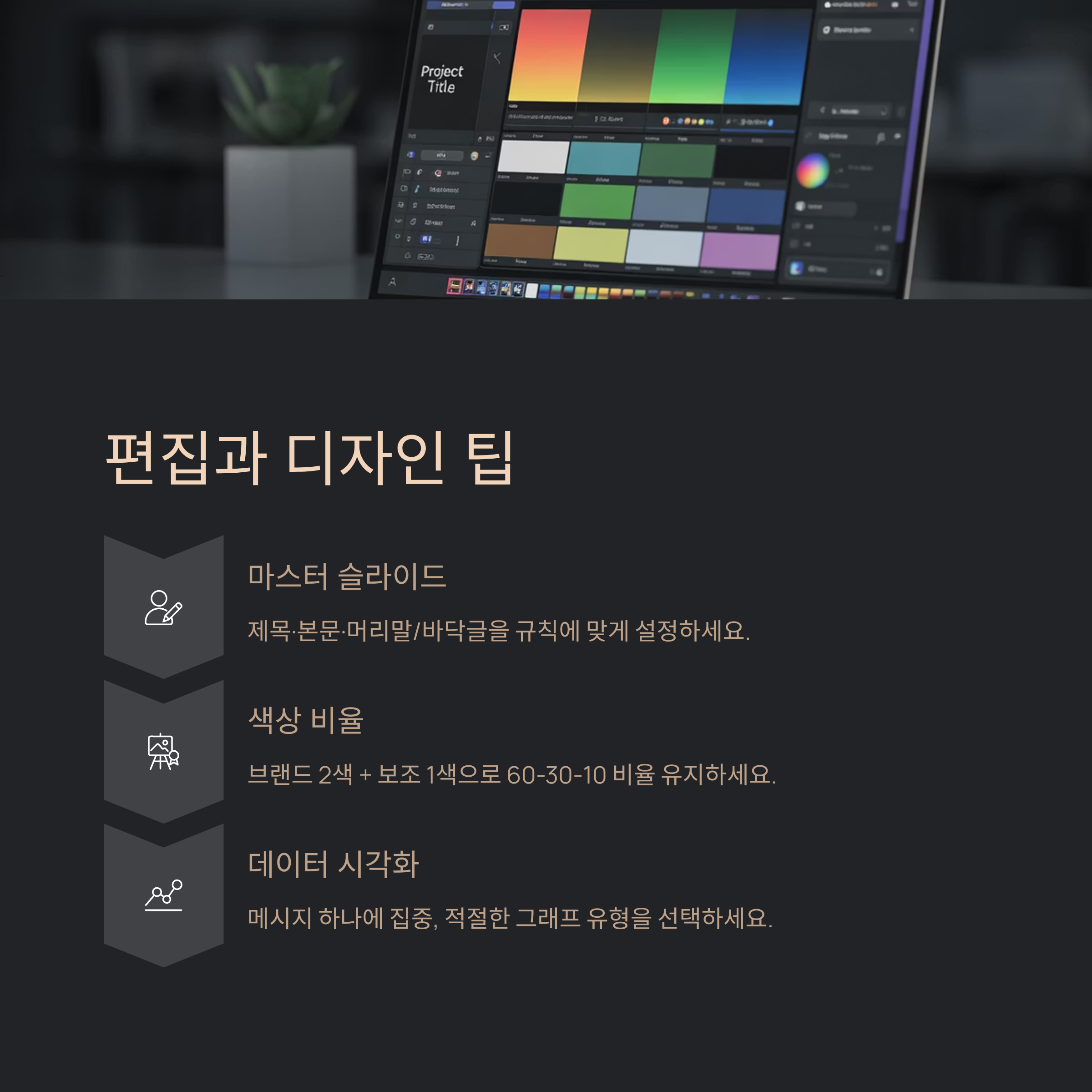 템플릿은 ‘뼈대’예요. 표지와 목차만 바꾸고 끝내기보다, 마스터 슬라이드에서 제목·본문·머리말/바닥말을 우리 규칙으로 맞춰 두면 이후 편집이 빨라져요. 그리드와 가이드 라인을 켜고, 도형/이미지 간 간격을 한두 값으로 통일하면 전체가 단정해 보여요. 색상은 브랜드 2색 + 보조 1색으로 60‑30‑10 비율을 유지하면 복잡해지지 않아요.