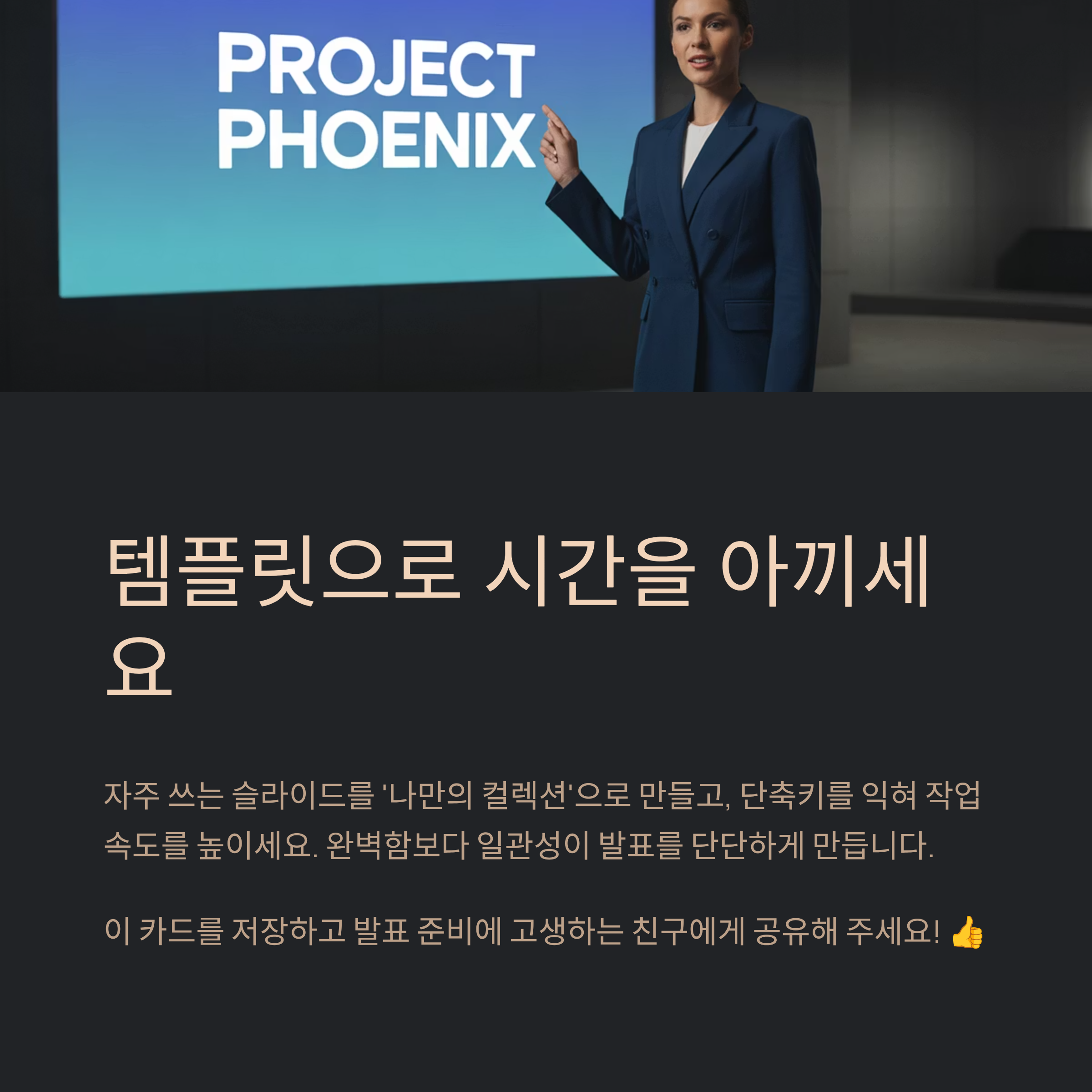단축키는 시간을 절약하는 직행로예요. 개체 정렬(Alt+Shift+화살표), 빠른 복제(Ctrl+D), 서식 복사(브러시), 선택 창(Alt+F10)을 익혀 두면 손이 훨씬 가벼워져요. 데이터 붙여넣기는 ‘원본 유지/값만’ 두 가지로 단순화하면 서식 붕괴를 막을 수 있어요. 이미지 압축과 미디어 최적화를 습관으로 두면 파일 용량도 안정돼요.