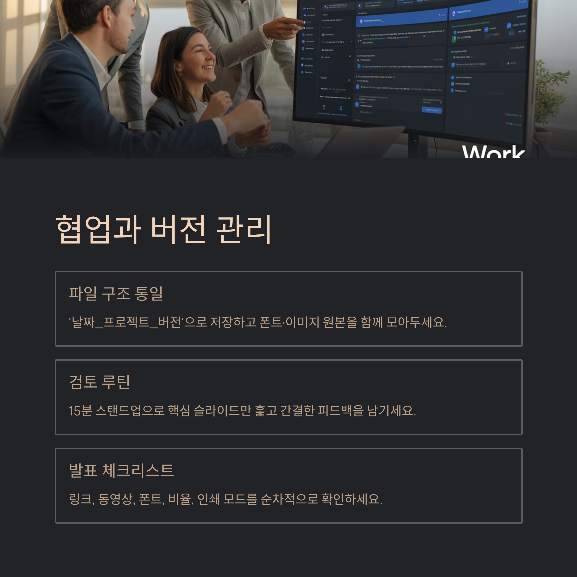 마감 직전엔 ‘발표 체크리스트’를 돌려요. 링크 깨짐, 동영상 재생, 폰트 대체, 비율 16:9/4:3 혼용, 인쇄 모드 대비, PDF 내보내기 설정을 차례대로 확인하면 큰 사고가 줄어요. 발표 현장은 변수투성이니, USB와 클라우드 링크를 둘 다 준비하고, 노트북·어댑터·리모컨·레이저 포인터까지 한 번에 챙겨요. 작은 준비가 멘탈을 지켜줘요.