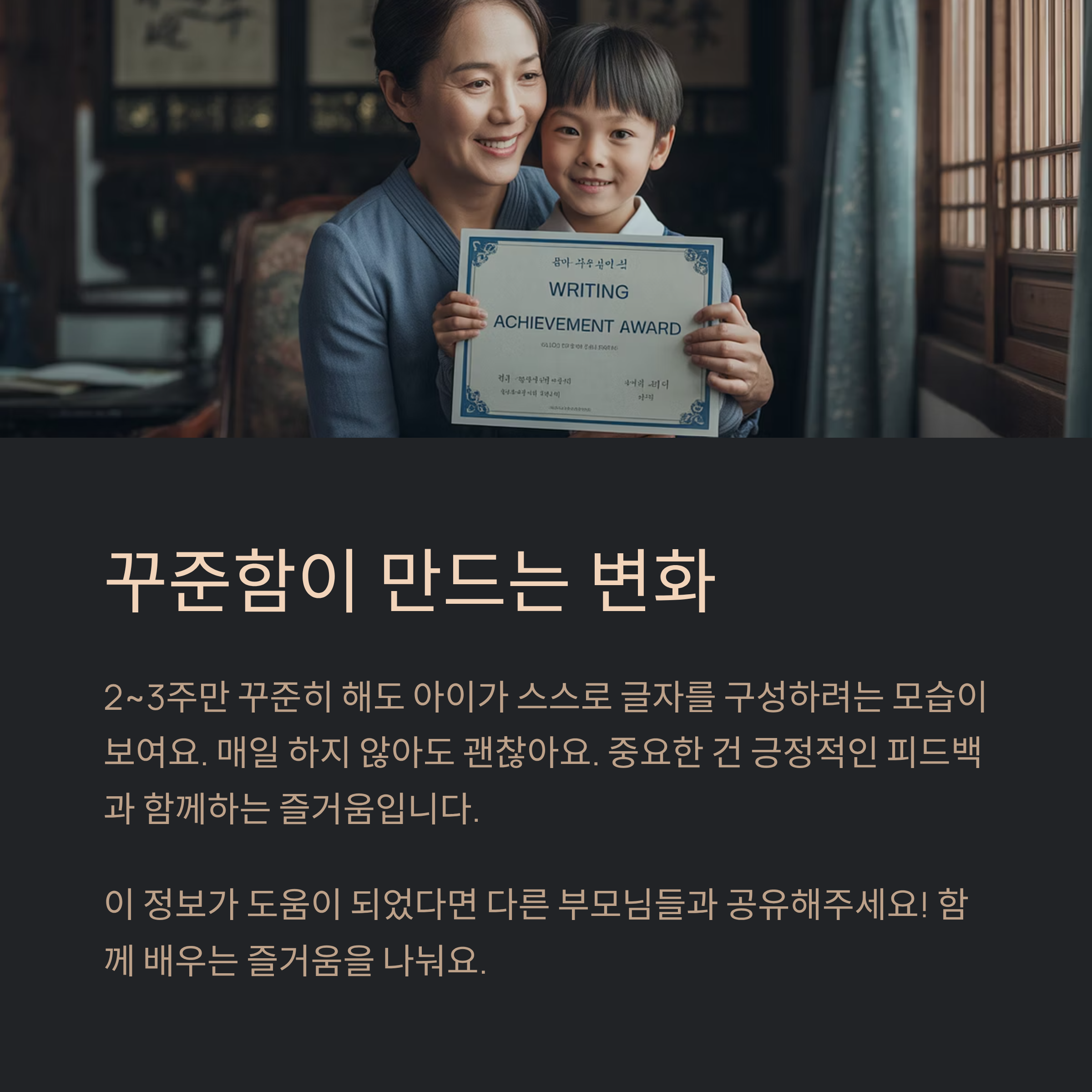 보통은 2~3주 정도만 꾸준히 해도, 아이가 스스로 글자를 구성하려는 모습이 보이기 시작해요. 처음엔 부모가 읽어주는 문장을 그대로 따라 쓰지만, 시간이 지나면 스스로도 문장을 구성해보려는 시도를 하게 돼요. 그런 변화가 나타날 때가 가장 기쁜 순간이죠.