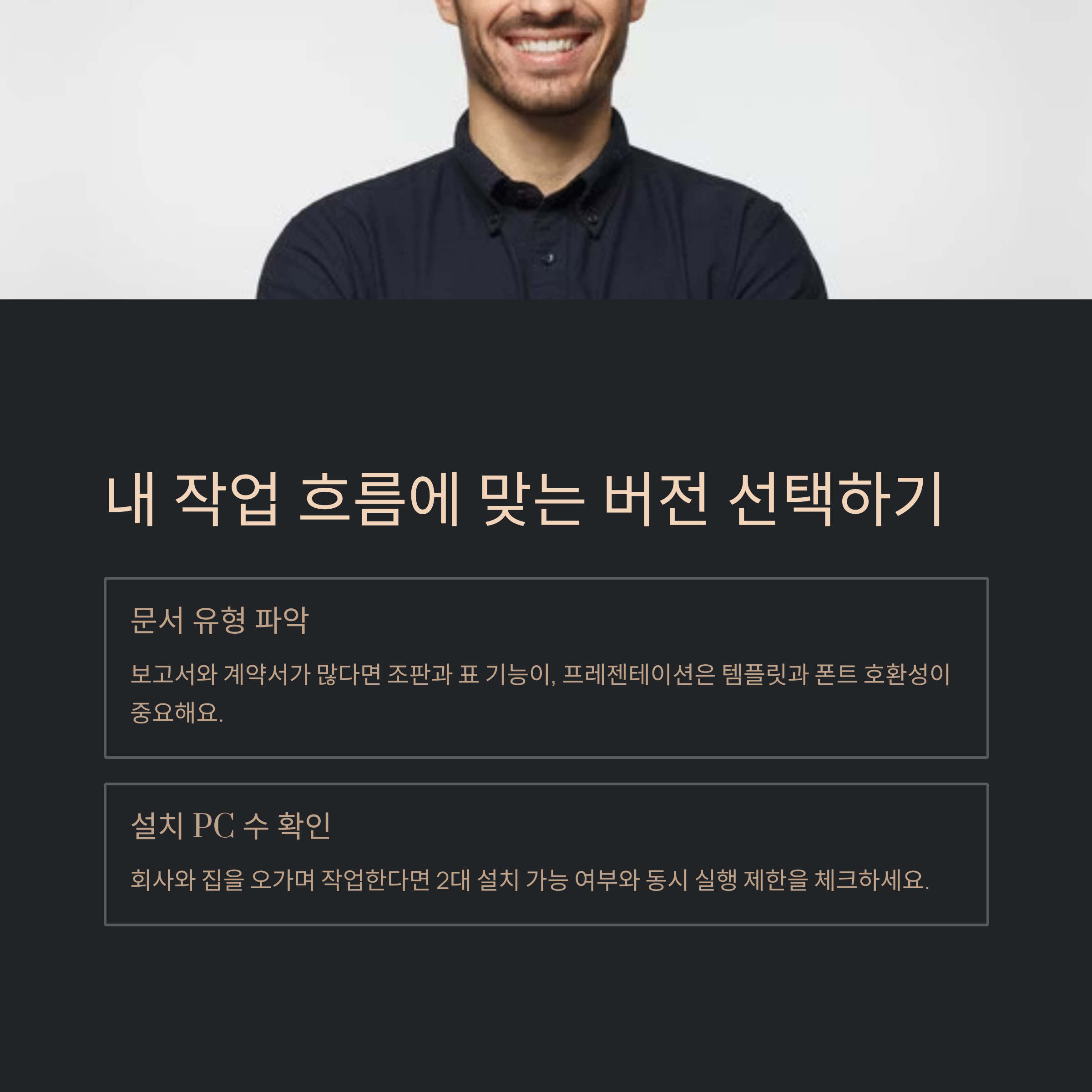 버전은 보통 기본형, 가정/학생용, 비즈니스용처럼 단위가 나뉘어요. 이름만 보면 큰 차이가 없어 보여도, 설치 가능한 PC 수나 상업적 사용 허용 범위가 달라져요. 회사 노트북과 데스크톱을 번갈아 쓰신다면 2대 설치가 가능한지, 동시 실행 제한이 있는지 확인하면 좋고요. 또 외부 협업이 잦다면 파일 포맷 호환성, 클라우드 저장, 공동 편집 같은 기능이 실제로 어느 수준까지 되는지 체험판으로 꼭 눌러보세요. 체험판을 한 번 돌려보면 손에 맞는지 금방 감이 와요.