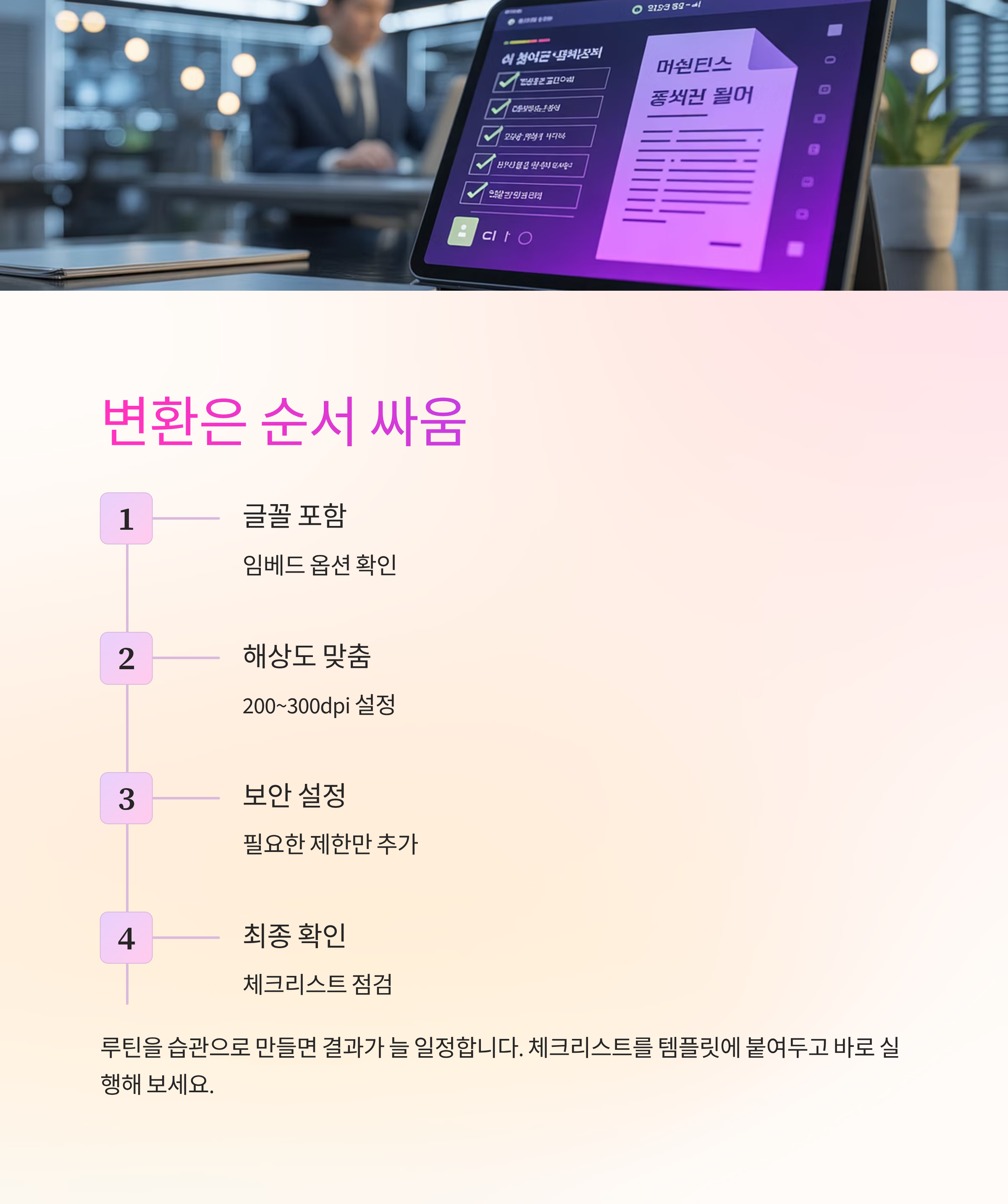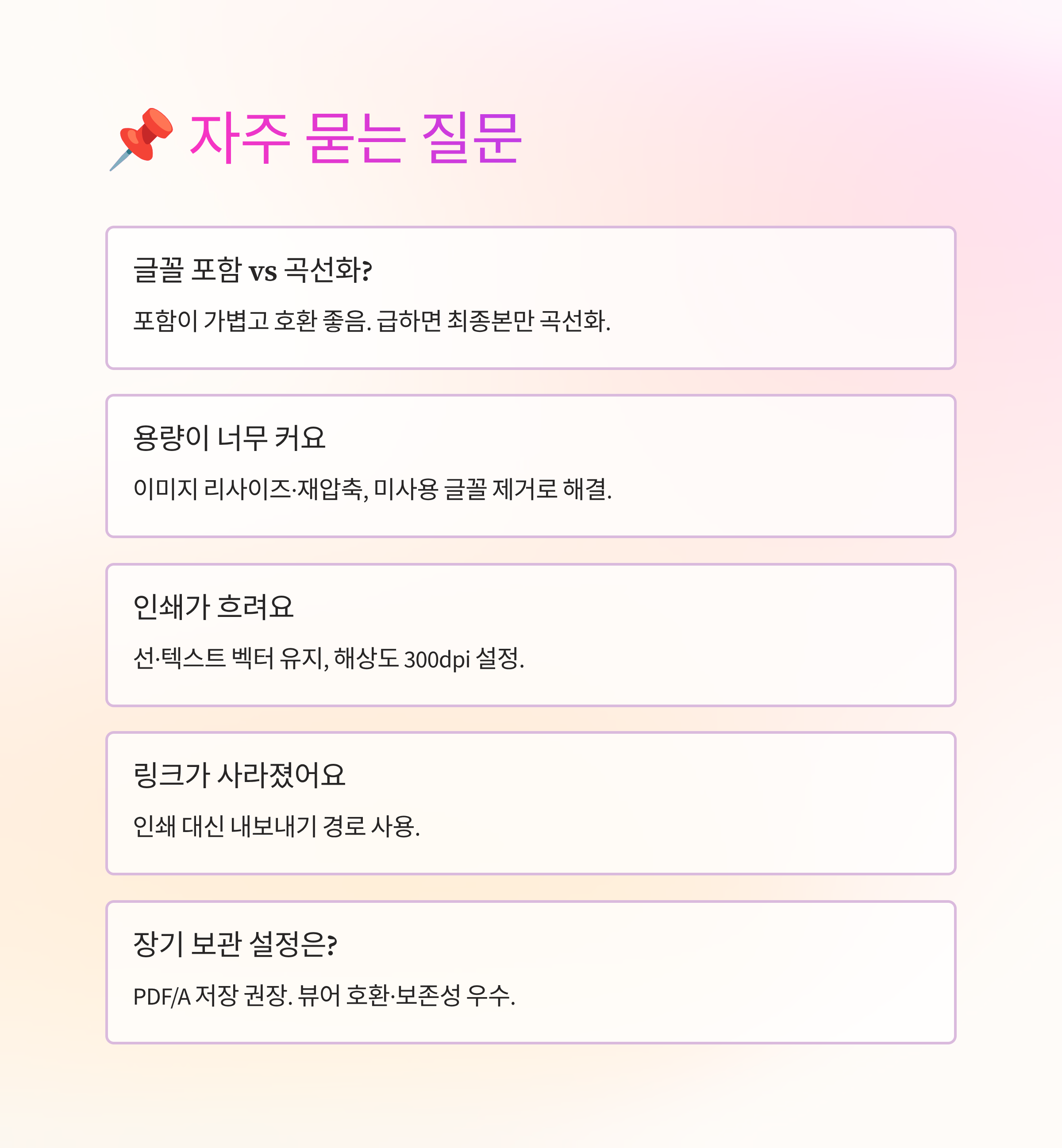 문서 변환은 결국 순서 싸움이더라고요. 글꼴을 포함하고, 해상도를 맞추고, 필요 보안만 얹는 흐름을 습관으로 만들면 결과가 늘 일정해요. 한두 번만 루틴을 돌려 보시면 다음 파일은 훨씬 가볍게 끝나요. 오늘 체크리스트를 템플릿에 붙여두고, 바로 다음 문서에서 그대로 실행해 보세요. 메일에 붙이는 순간까지 마음이 편해질 거예요.