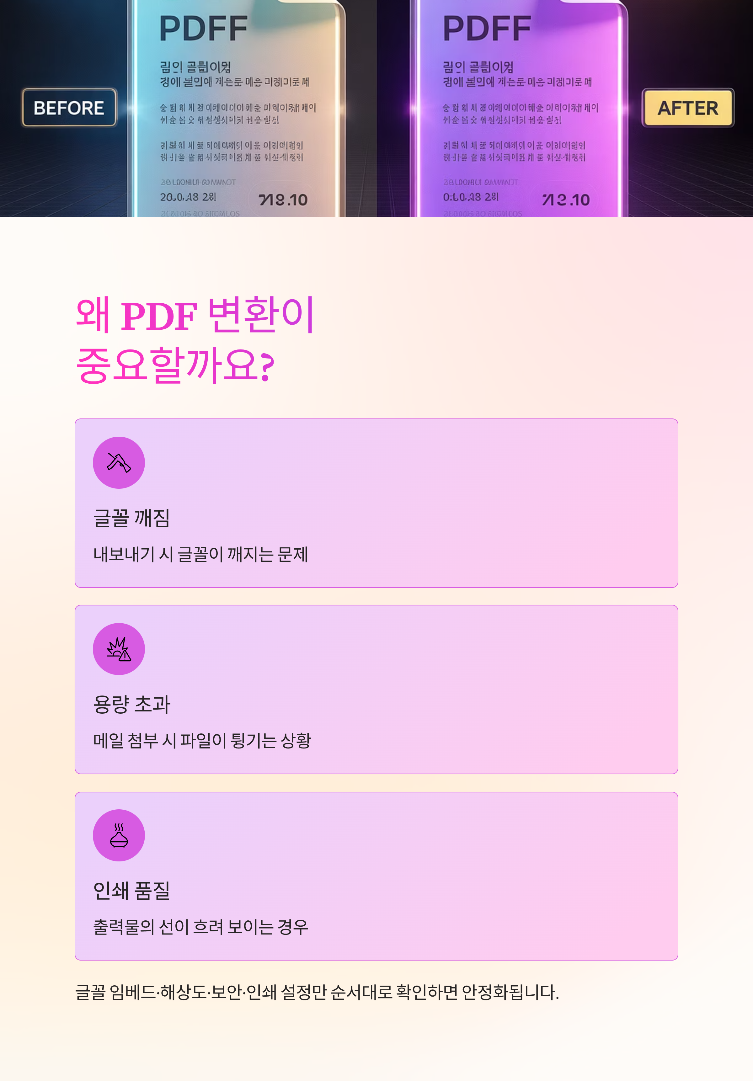 웹 배포는 화면 글꼴 렌더링이 달라서 더 튈 수 있어요. PDF 뷰어 미리보기로 100% 확대에서 한번만 확인해요.