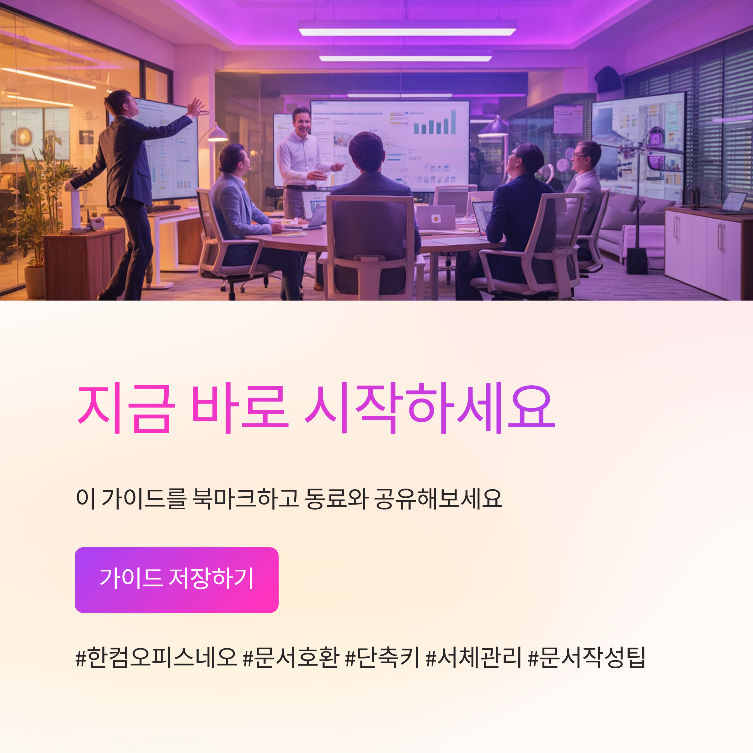 마지막에 단축키 표를 한 페이지로 만들어 책상 옆에 붙여두면 좋아요. 팀에서 같이 쓰면 학습 비용이 줄고 업무 속도가 맞춰져요. 익숙해지면 자연스럽게 한컴오피스네오의 리본과 단축키가 손에 붙어서, 문서 하나 끝내는 시간이 체감으로 줄어들 거예요.