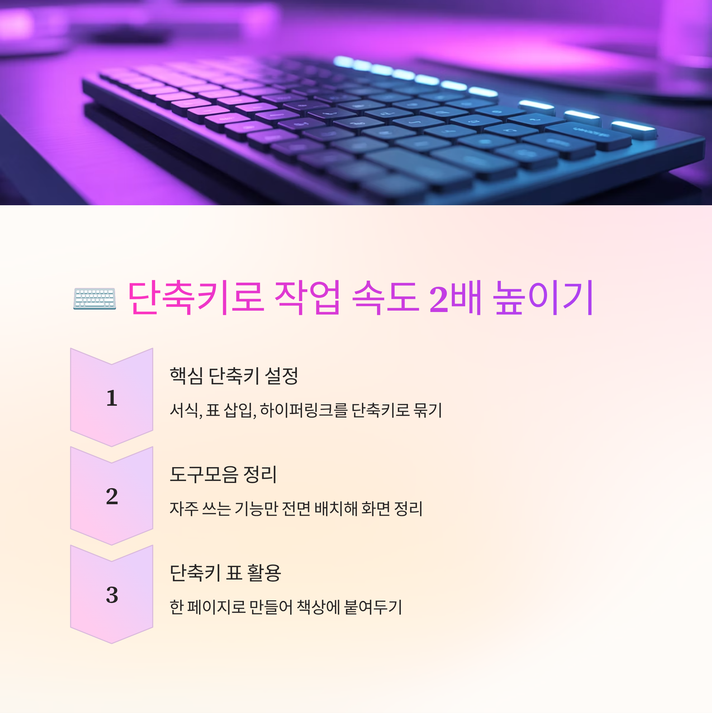 문서 편집 속도의 핵심은 결국 손의 이동을 줄이는 거예요. 자주 쓰는 서식(제목, 본문, 인용), 표 삽입, 하이퍼링크, 최근 파일 열기를 단축키로 묶어두면 클릭 수가 눈에 띄게 줄어요. 커서 이동은 문단 단위·표 셀 단위로 구분해 익혀두면 더 빨라요.