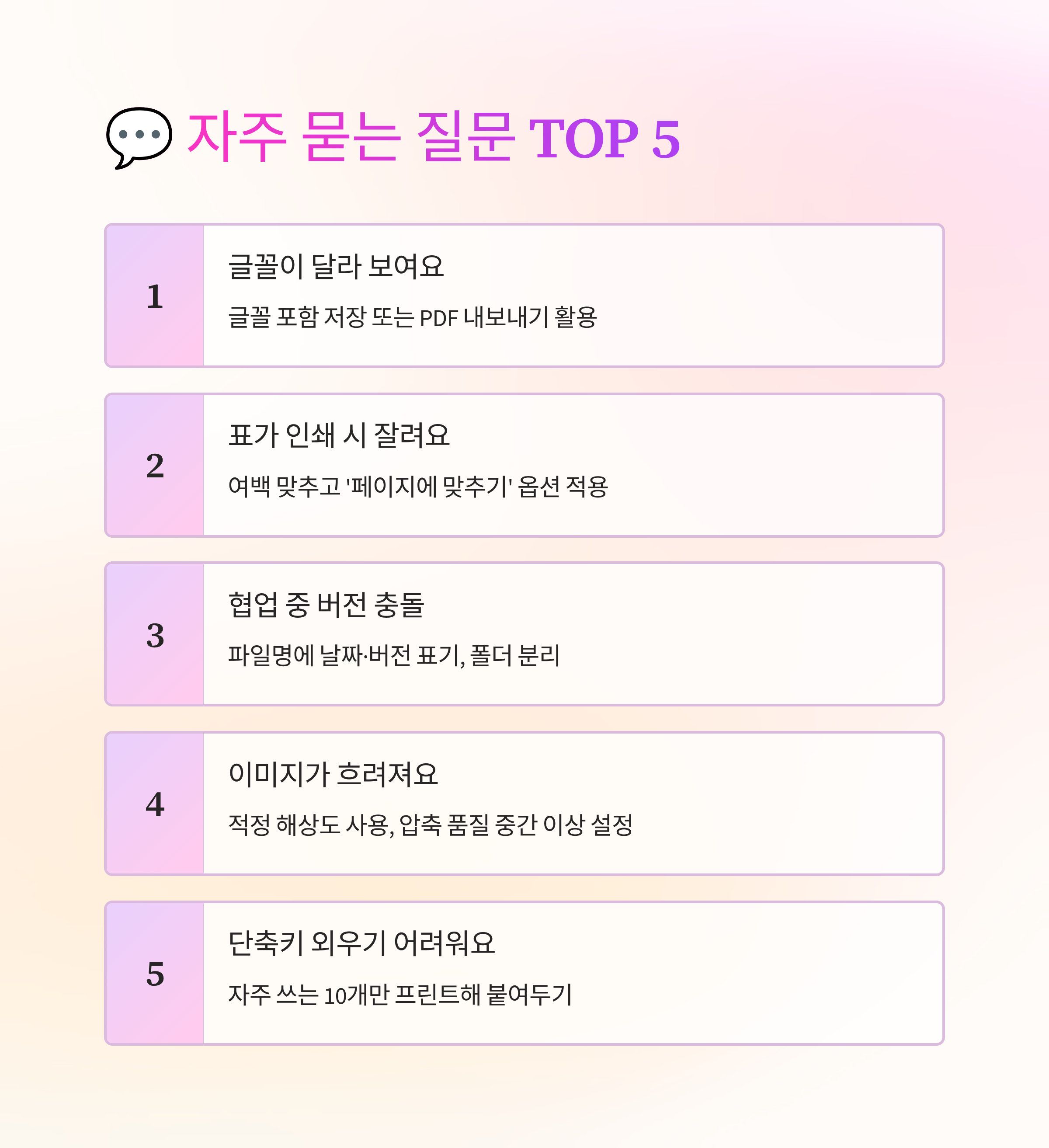 내보내기 전에 글꼴 포함 여부를 확인해보세요. 제공되지 않는 글꼴을 썼다면 대체 글꼴을 미리 지정하거나 PDF로 고정해 두는 편이 안전해요. 표나 도형이 많은 문서는 스크린샷을 일부 삽입해 레이아웃을 보강하면 어긋남이 덜해요.