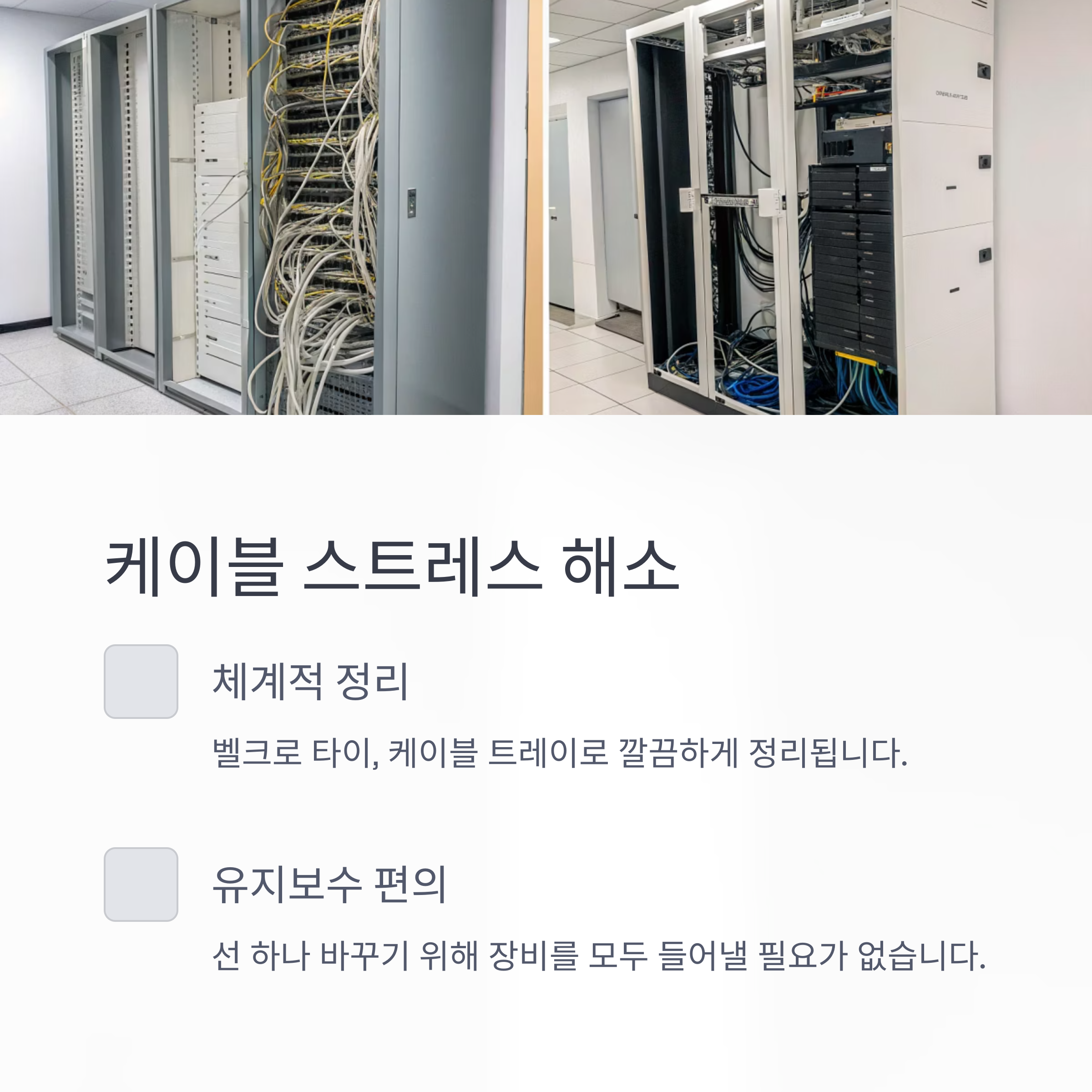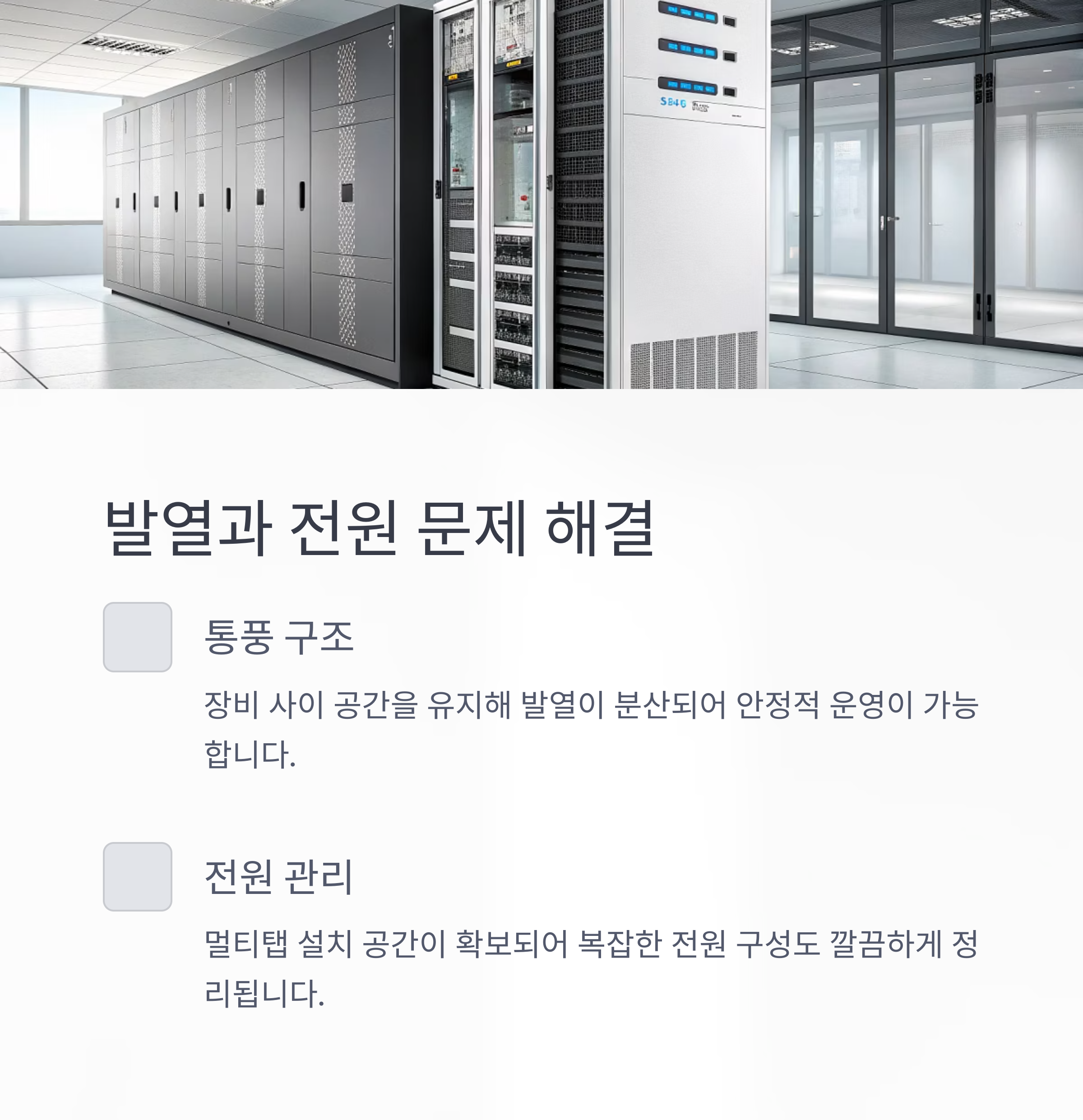 특히 장비 사이 공간을 일정하게 유지할 수 있는 유닛별 구조 덕분에, 발열이 한쪽으로 몰리지 않고 분산되어 훨씬 안정적인 운영이 가능했어요. 팬이나 흡기 장치를 추가로 설치하기도 수월한 형태라 활용도가 높았고요.
