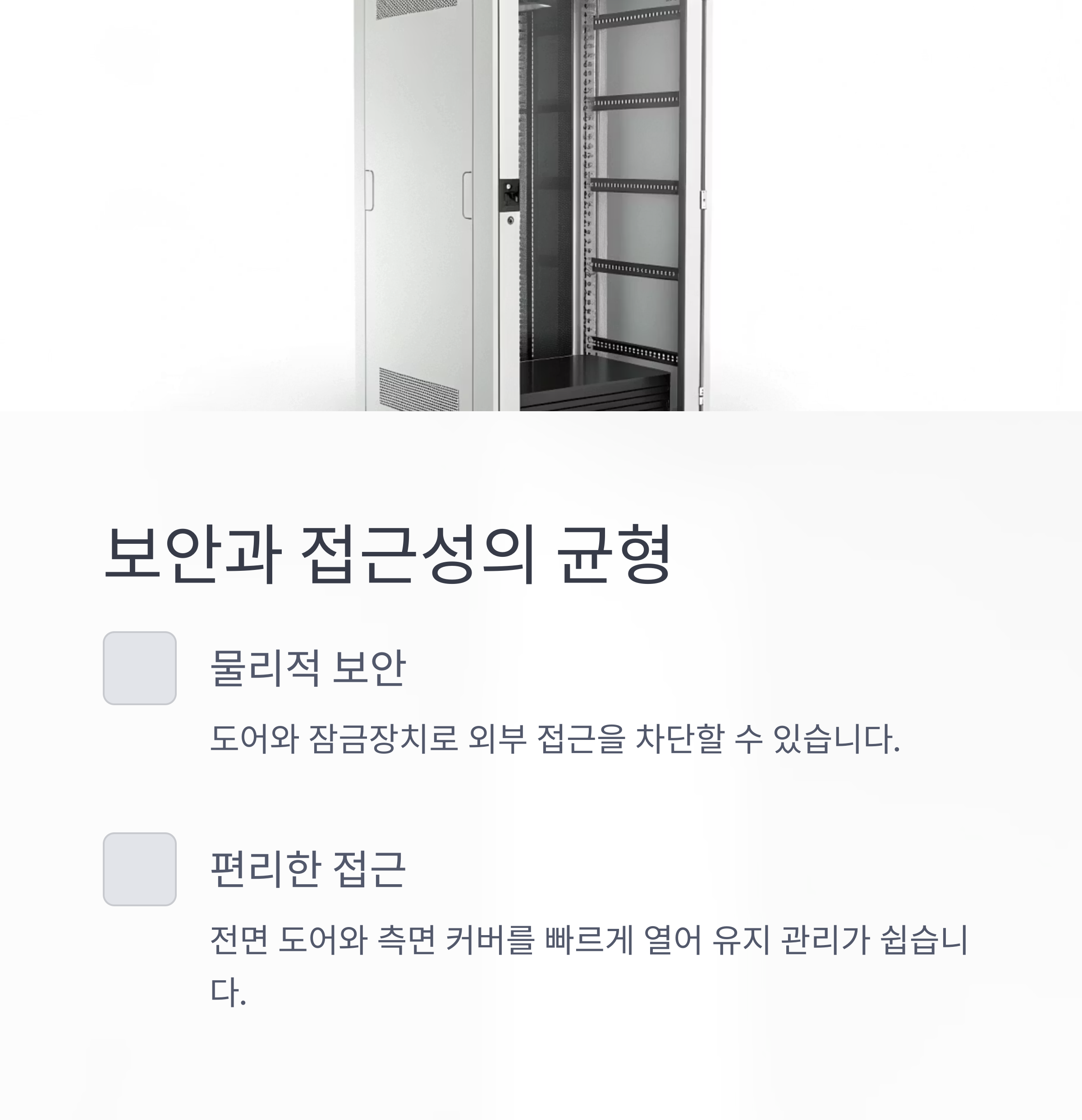 도어가 달린 모델을 선택할 경우 잠금장치를 통해 물리적인 접근을 차단할 수 있었고, 장비를 잘 보이게 하면서도 터치로부터 보호할 수 있는 아크릴 도어 옵션도 있어서 상황에 따라 유연하게 선택할 수 있었어요.