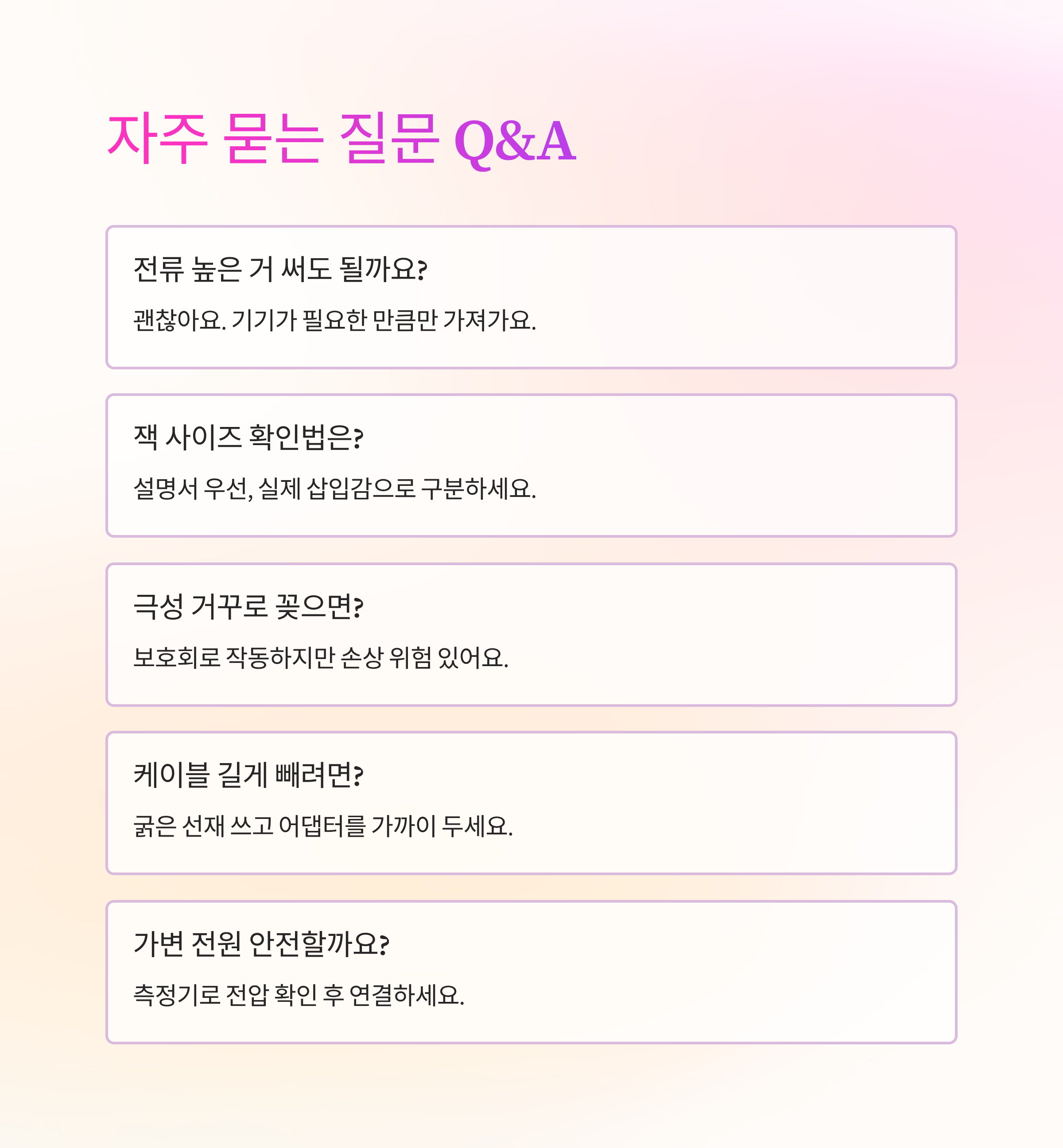 연결 후엔 코어 노이즈가 들리는지, 케이스가 과하게 뜨거워지지 않는지 손으로 한 번 점검해요. 냄새가 나거나 딱딱거리는 소리가 들리면 즉시 분리하고 교체를 고려해요. 값싼 제품을 여러 번 사는 것보다 검증된 제품 하나가 훨씬 경제적이에요.